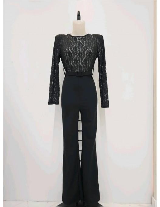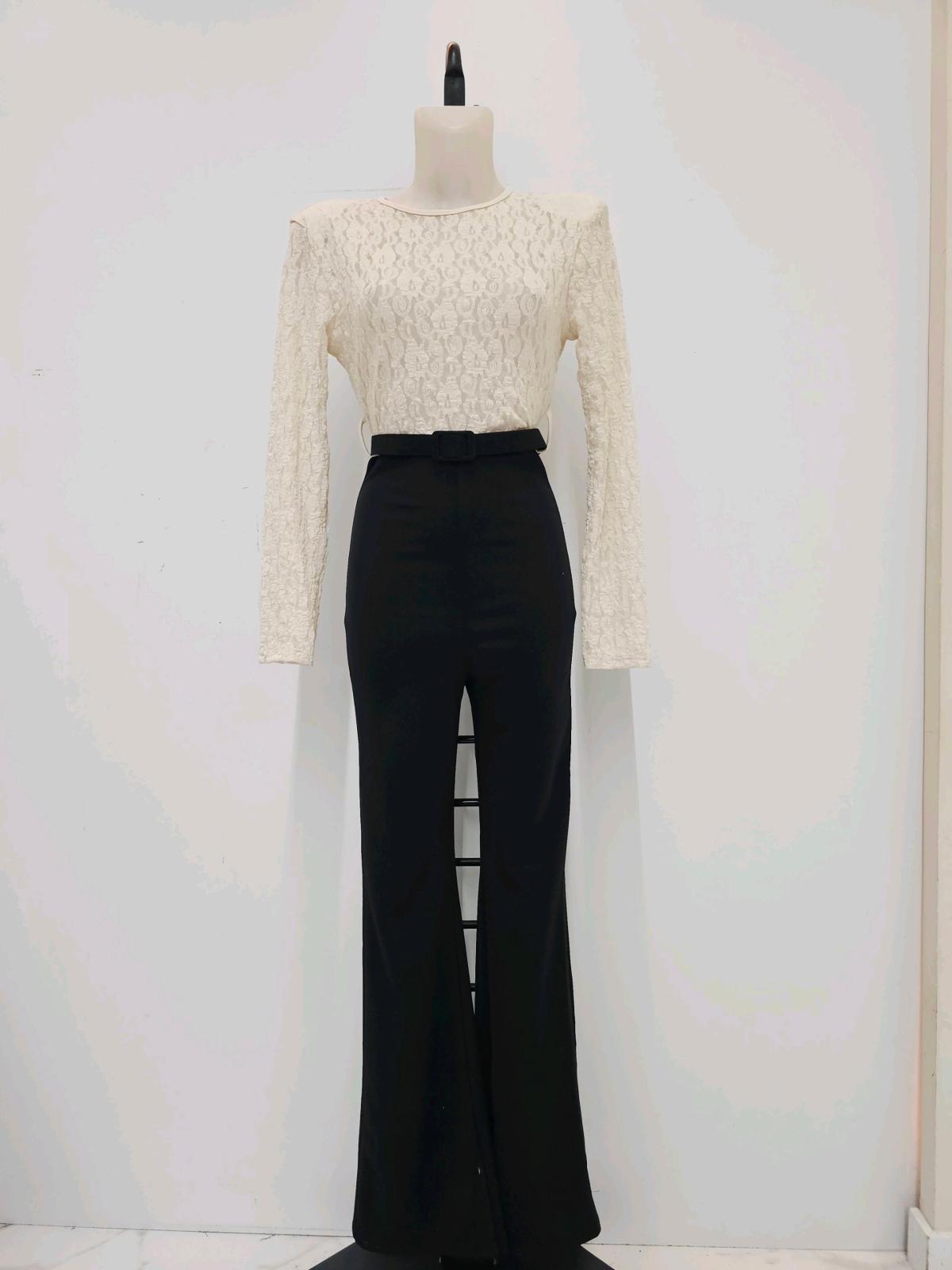 La parte superior, de encaje semitransparente, juega entre lo sugerente y lo refinado, mientras el pantalón de corte acampanado alarga la figura y estiliza cada paso. El cinturón incluido marca la cintura y le da ese aire de “voy perfecta sin haberlo intentado”.