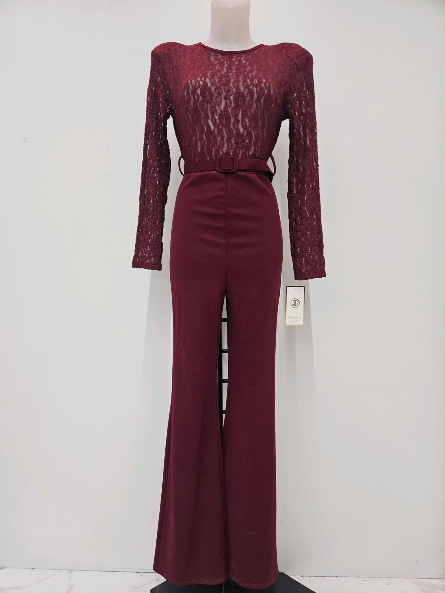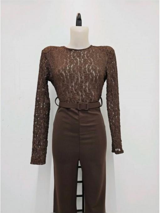 Mono largo de encaje con cinturón, elegante, ajustado y con un punto de osadía. Realza la figura con un toque sofisticado y muy femenino.