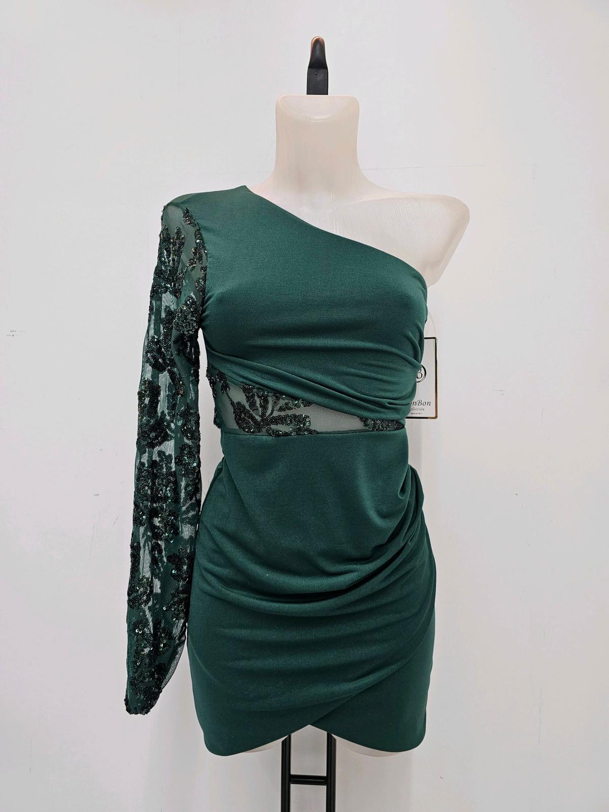 Vestido asimétrico con una manga de encaje y lentejuelas. Brilla sin exagerar, deslumbra sin pedir permiso.