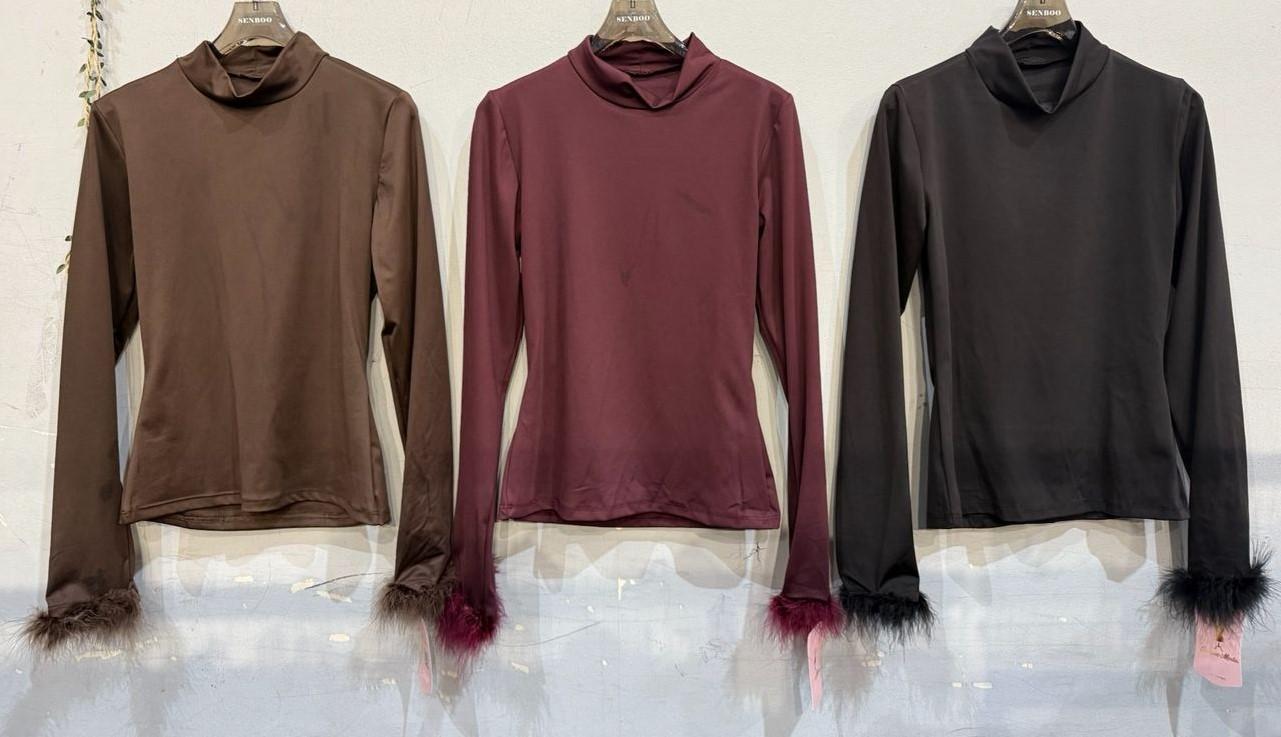 Blusa de licra gruesa con cuello alto y puños de plumas. Elegante, elástica y perfecta para looks de noche.
