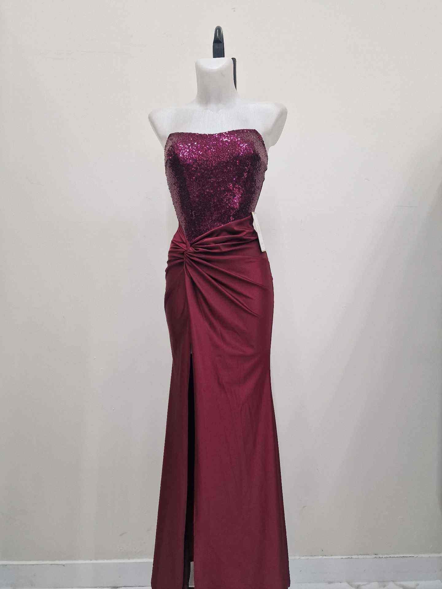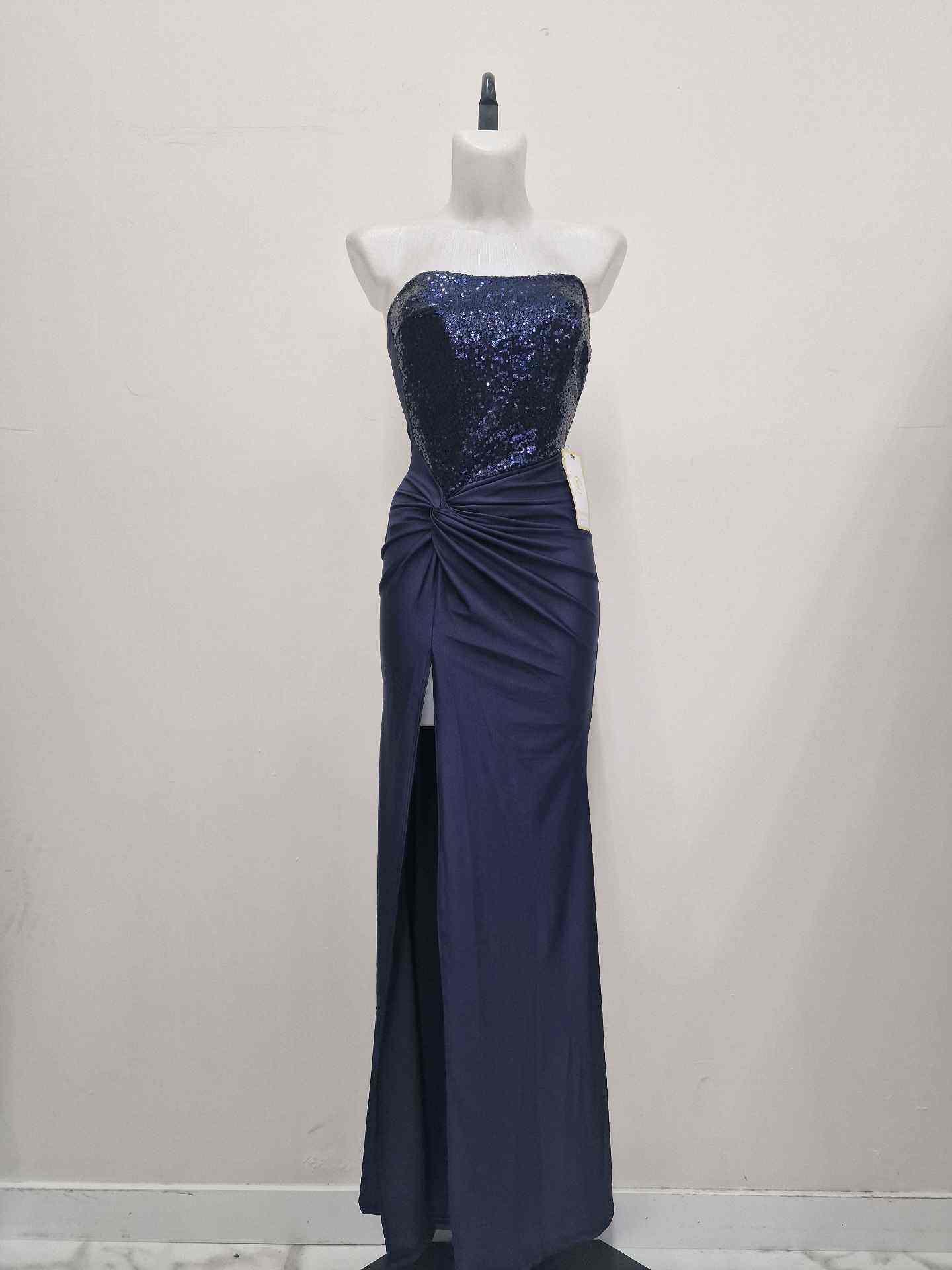 Vestido largo de fiesta con palabra de honor, lentejuelas en el cuerpo y falda con frunce y abertura lateral. Elegante, favorecedor y luminoso.