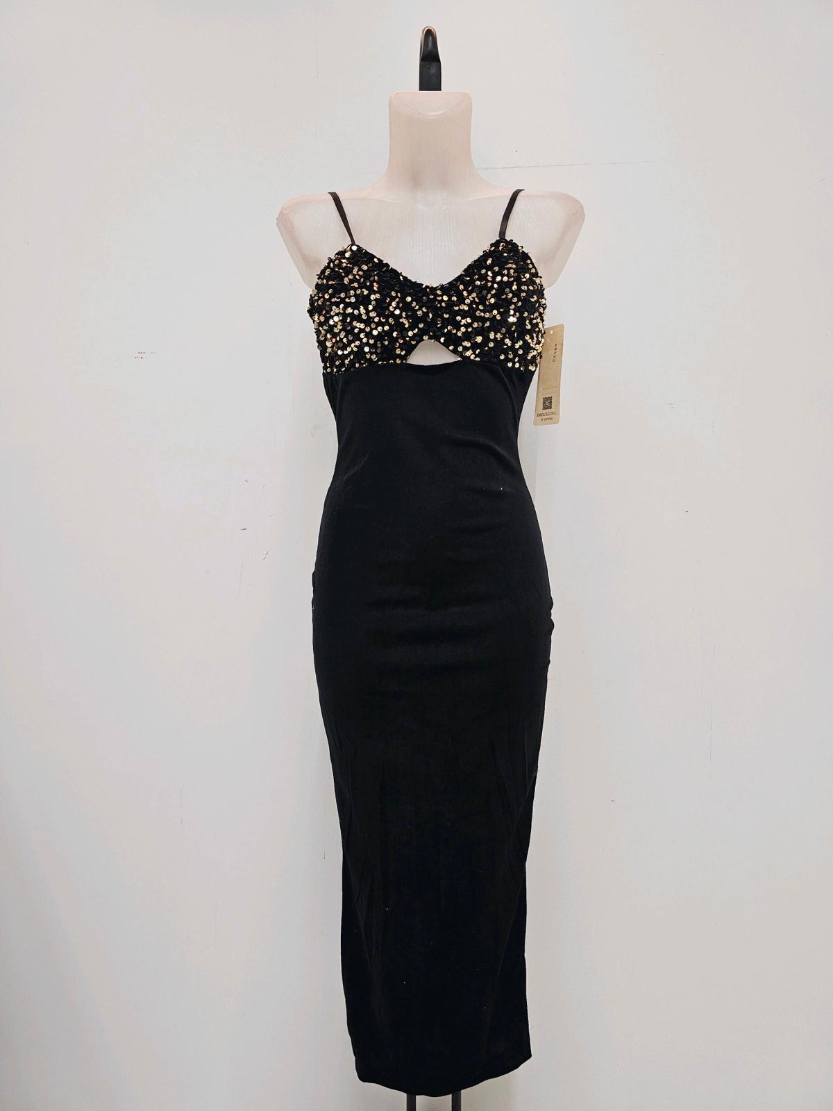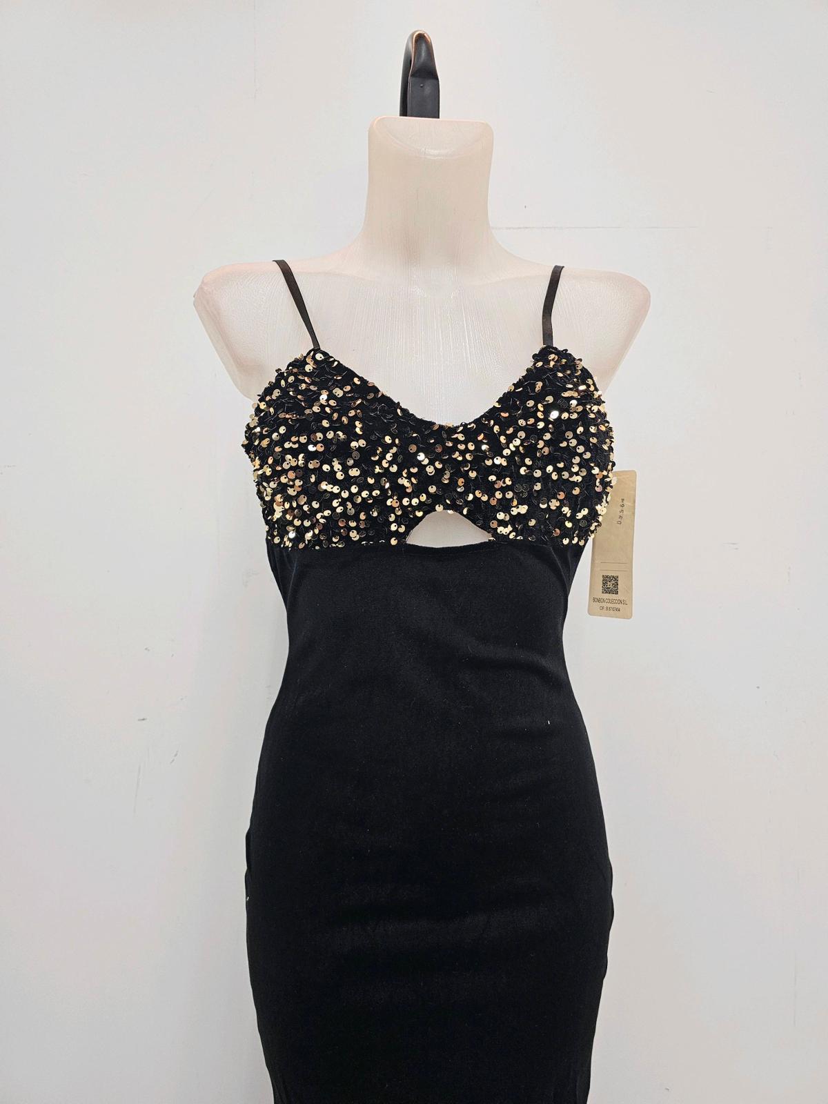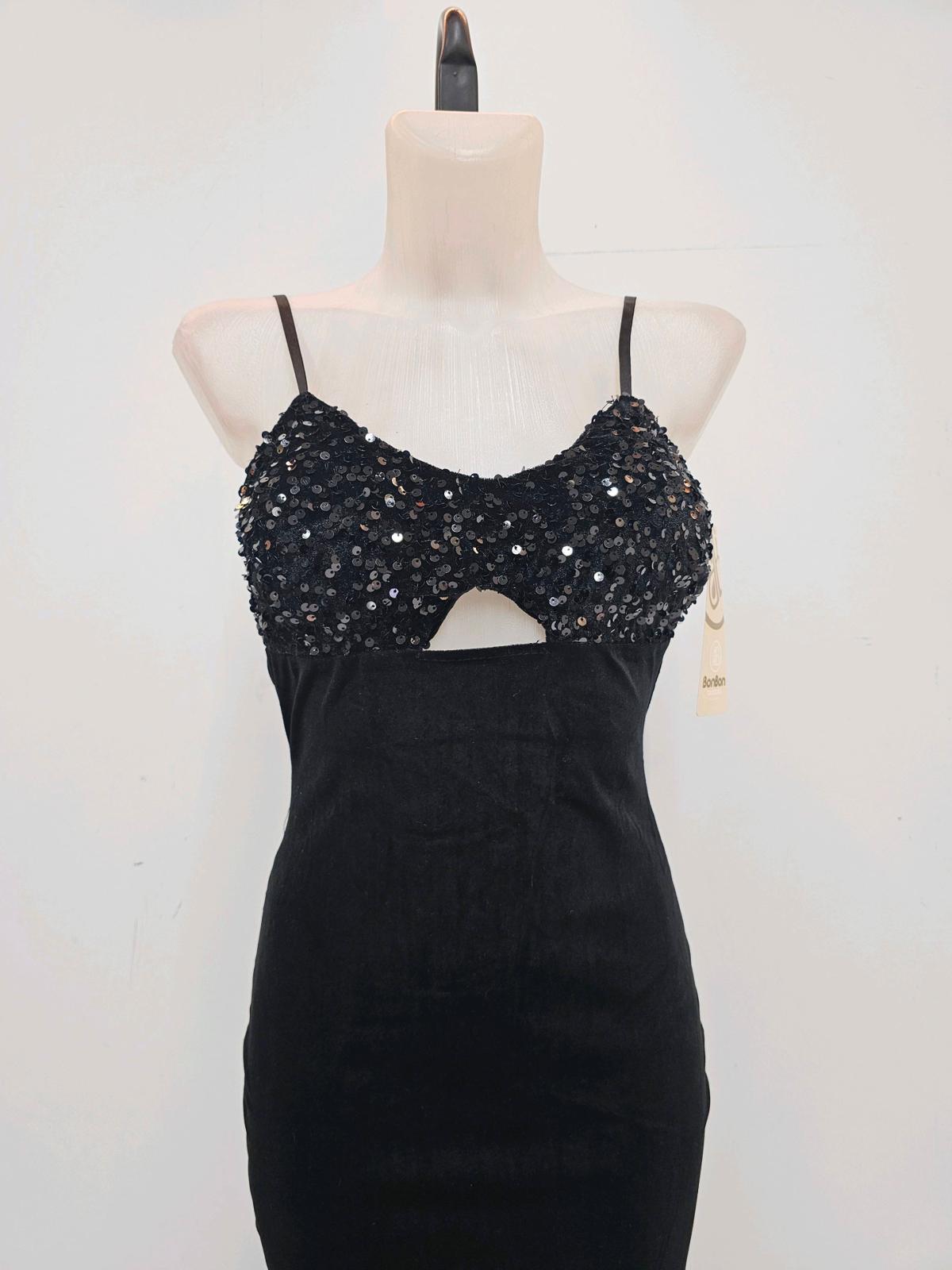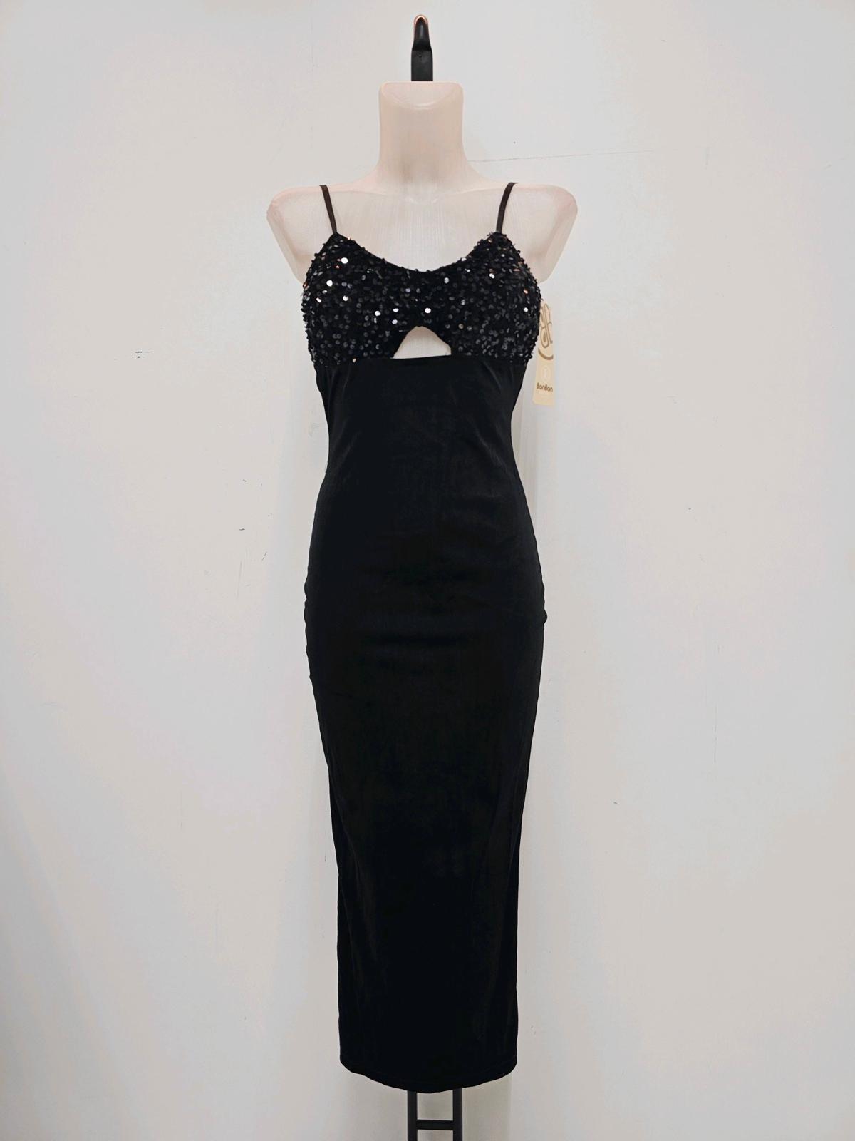 Vestido midi con cuerpo de lentejuelas, tirantes finos, cut-out bajo el pecho y falda de terciopelo elástico. Elegante, favorecedor y perfecto para eventos.