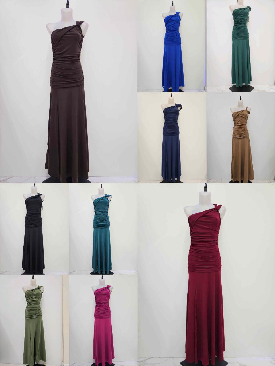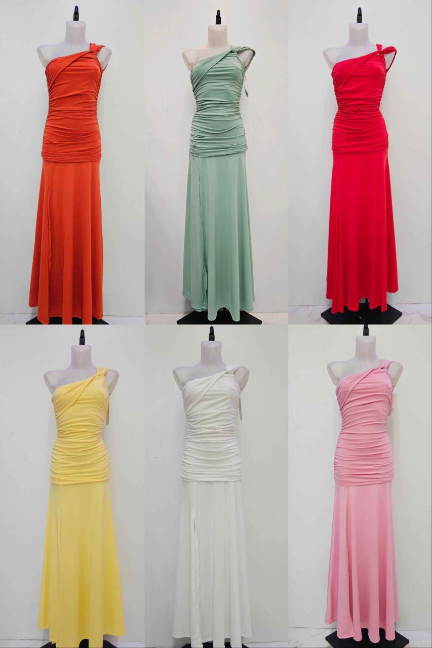 Vestido largo asimétrico con fruncido y abertura frontal. Elegante, favorecedor y perfecto para eventos especiales.