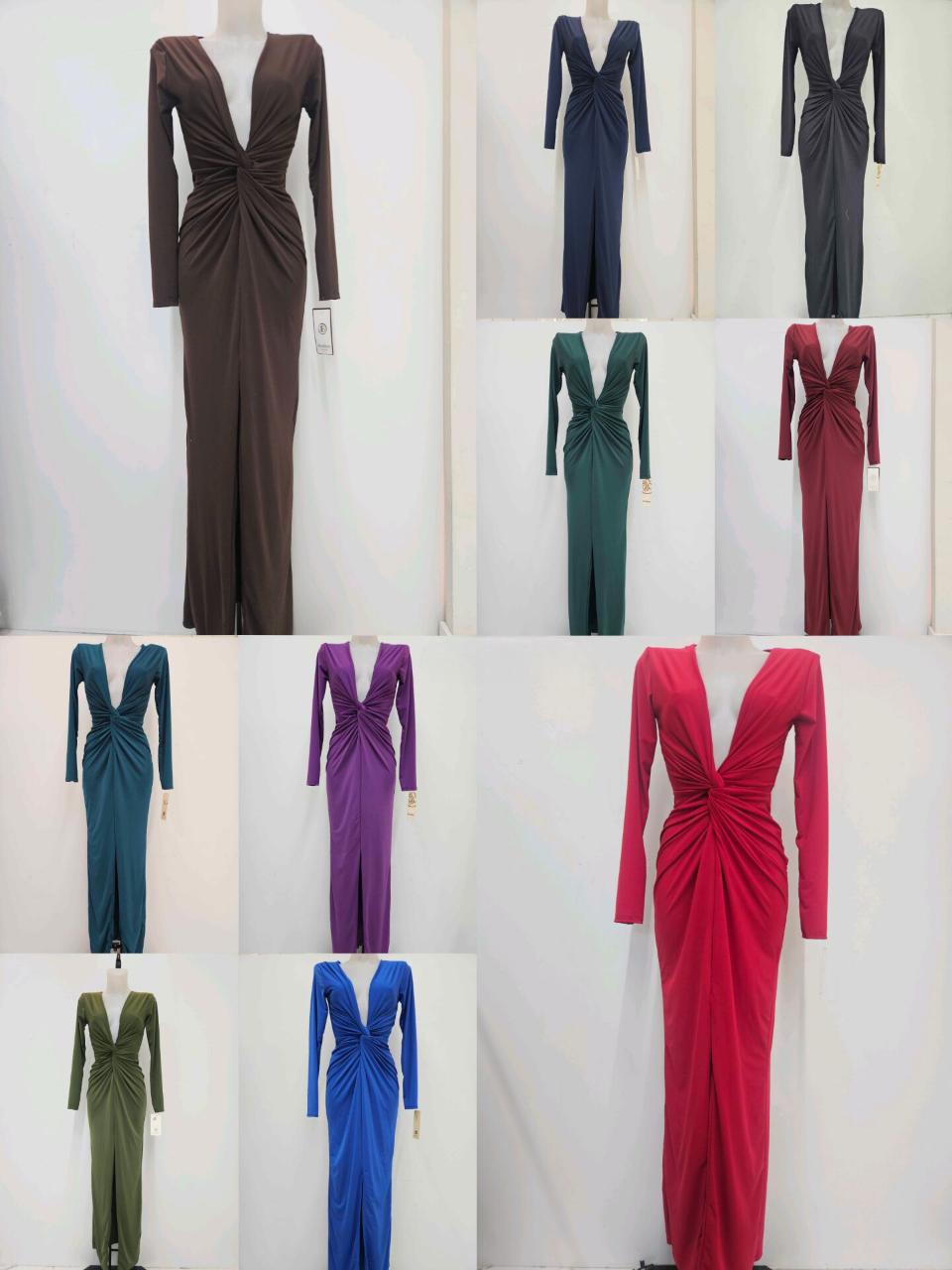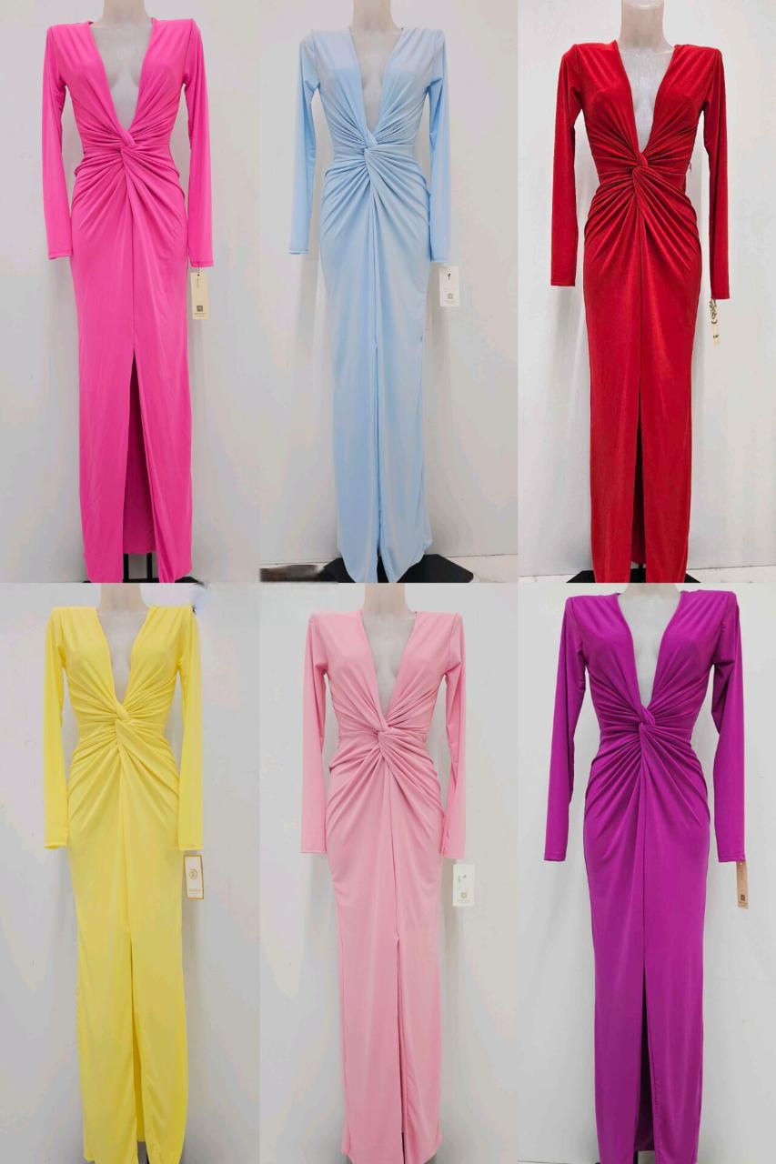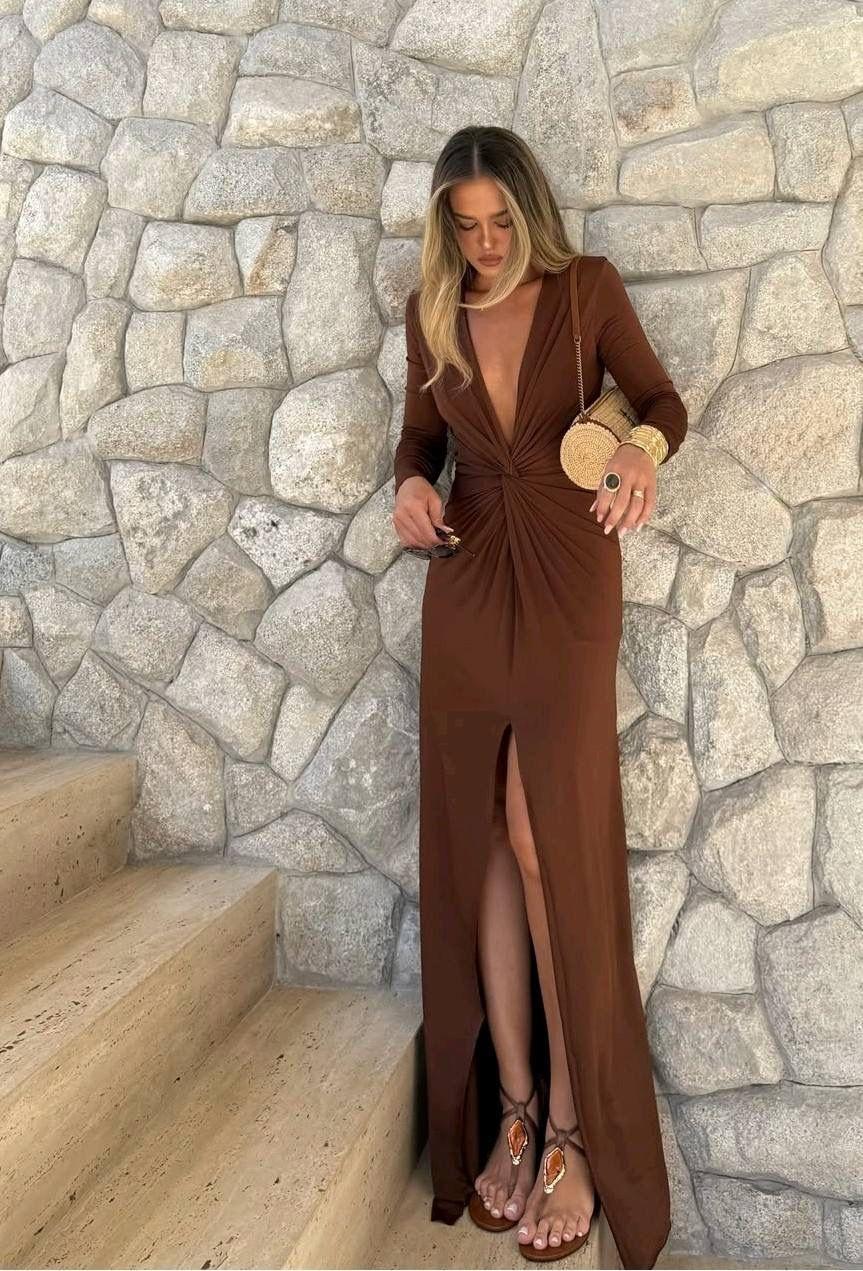 Vestido largo con escote en pico drapeado y mangas largas. Elegante, favorecedor y perfecto para invitadas.