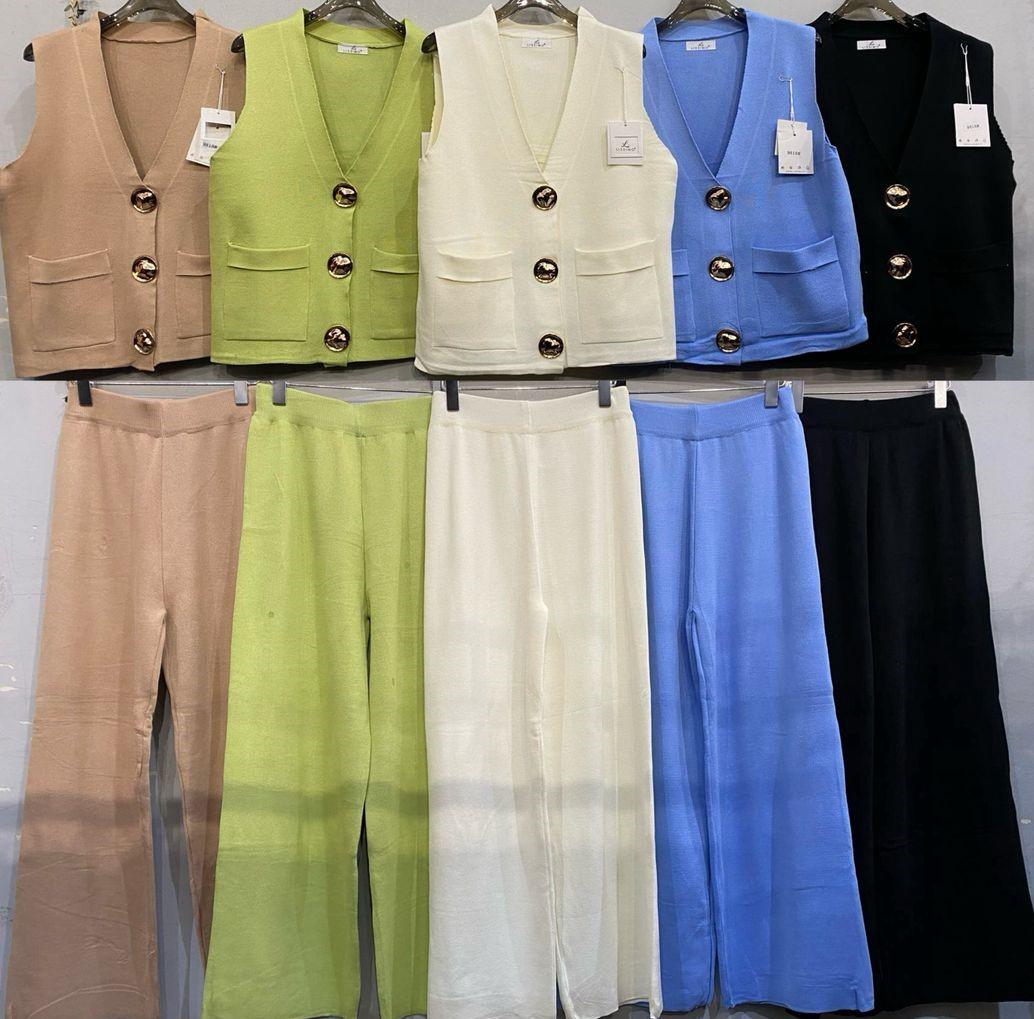 El conjunto que te soluciona el “no sé qué poner” en 10 segundos. Dos piezas de punto con caída bonita: chaleco sin mangas con escote pico y pantalón palazzo amplio, cómodo y elegante.