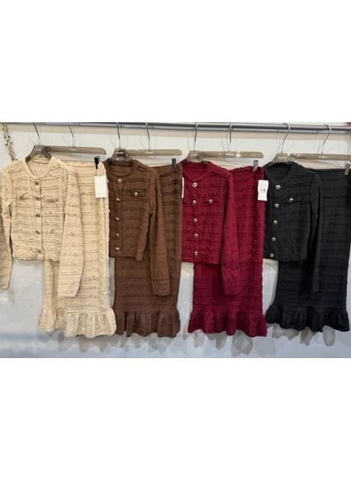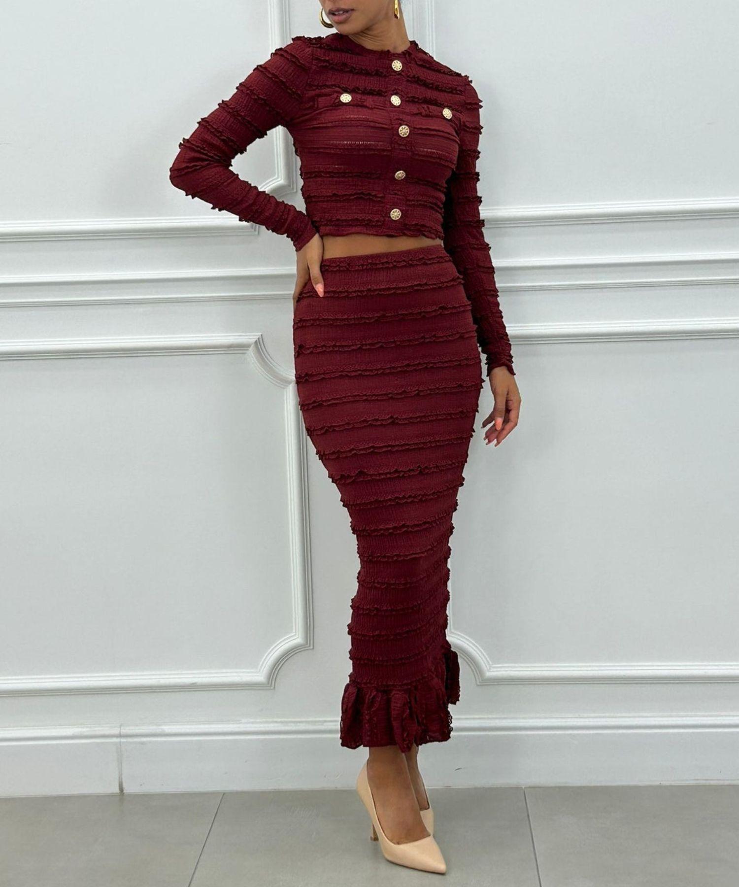 Conjunto de blusa y falda con una estética chic que se ciñe a la silueta. Mucha elegancia... El top presenta mangas largas, botones dorados decorativos y una textura ligera con detalles en relieve, mientras que la falda es de cintura alta, con un corte tubo que termina en un discreto volante. La tela elástica ofrece comodidad y un ajuste perfecto.