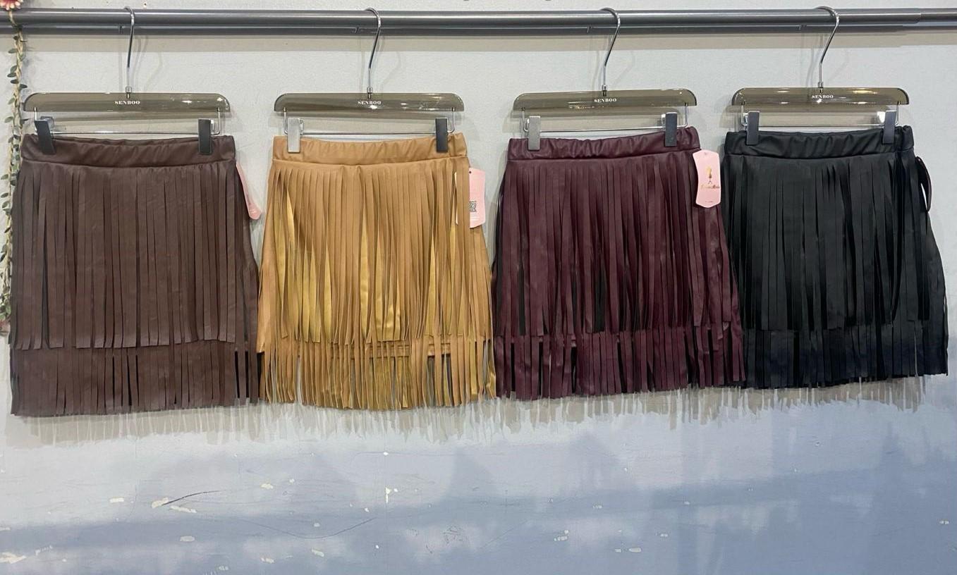 Falda de polipiel con flecos, lista para robar miradas con cada paso. Tiene ese aire entre rockera y salvaje que convierte cualquier movimiento en un “boom”. Ideal con botas altas, blazer o tu chaqueta favorita.