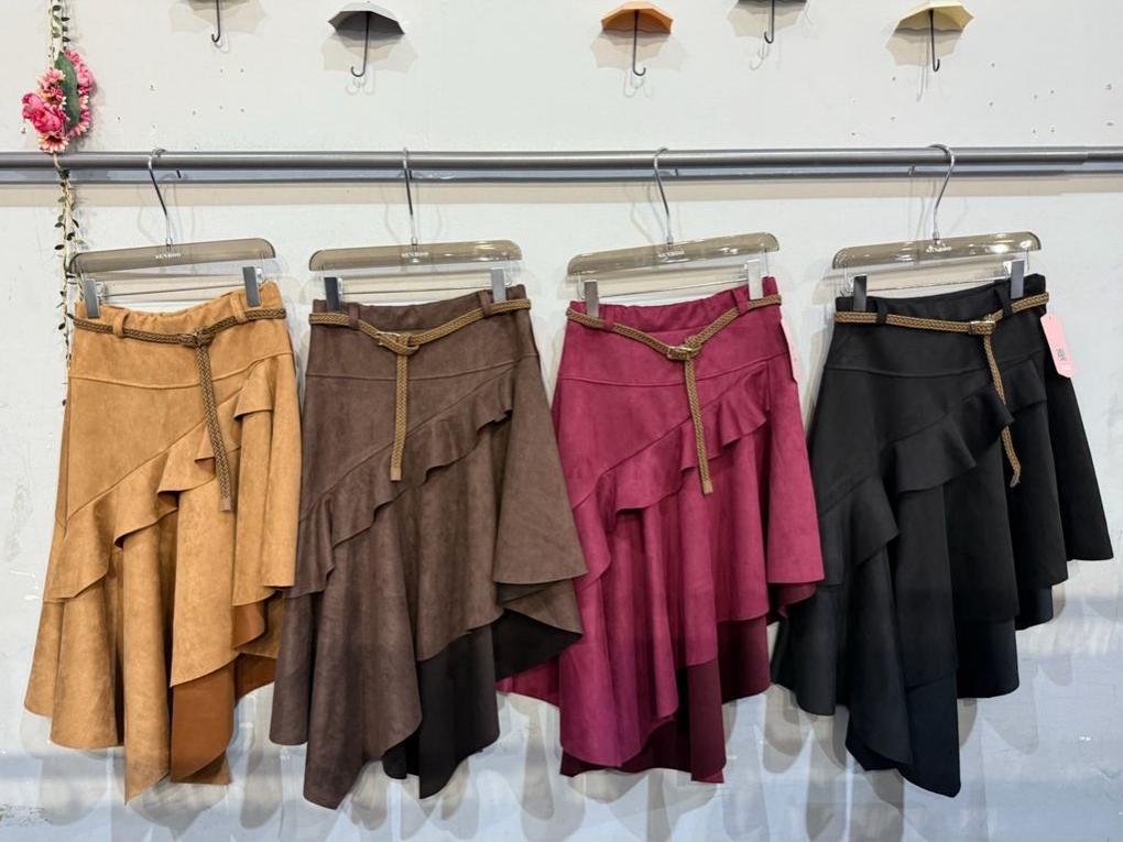 Falda asimétrica de antelina con cinturón trenzado y vuelo en capas que da ese toque de movimiento irresistible. Ideal para combinar con botas altas y marcar estilo sin despeinarte. Si te gusta el rollo boho chic… esta falda grita tu nombre.