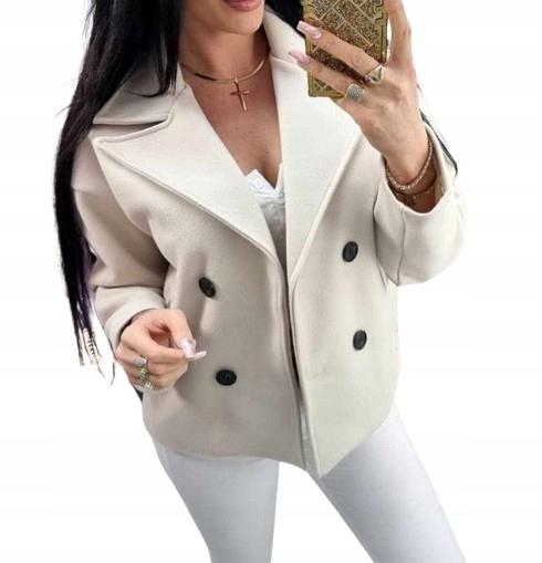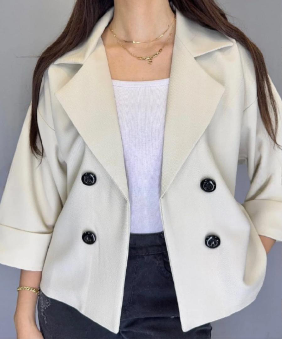 Chaqueta corta de estilo oversize y doble botonadura, con solapas amplias que le dan un toque elegante pero desenfadado.