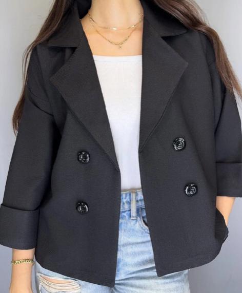 Abrigo corto cruzado con solapa ancha y botones dobles. Elegante, moderno y con ese punto “me lo pongo y parezco de revista sin esfuerzo”. Ideal para combinar con vaqueros, faldas o lo que quieras, porque queda bien con todo.