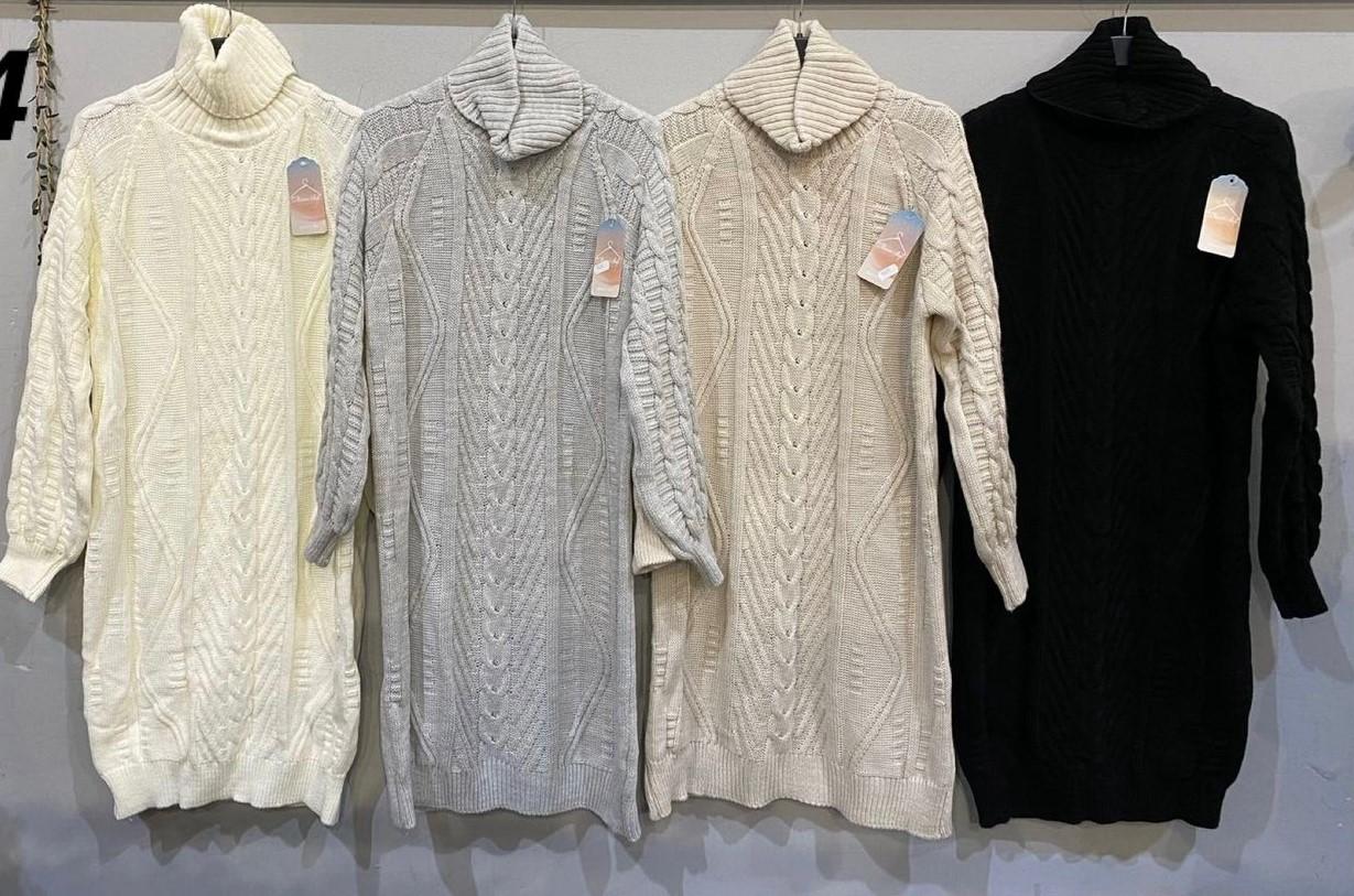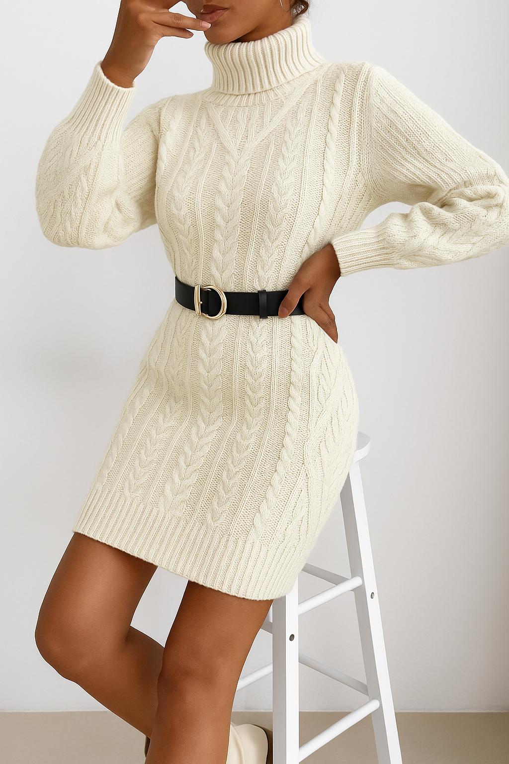Vestido de punto grueso con cuello alto y diseño trenzado, ideal para los días fríos pero con mucho estilo. Su tejido es suave, calentito y tiene ese aire “sofá chic” que te permite pasar del plan de manta al brunch sin cambiarte. Puedes llevarlo suelto para un look relajado o ajustarlo con un cinturón para marcar figura.