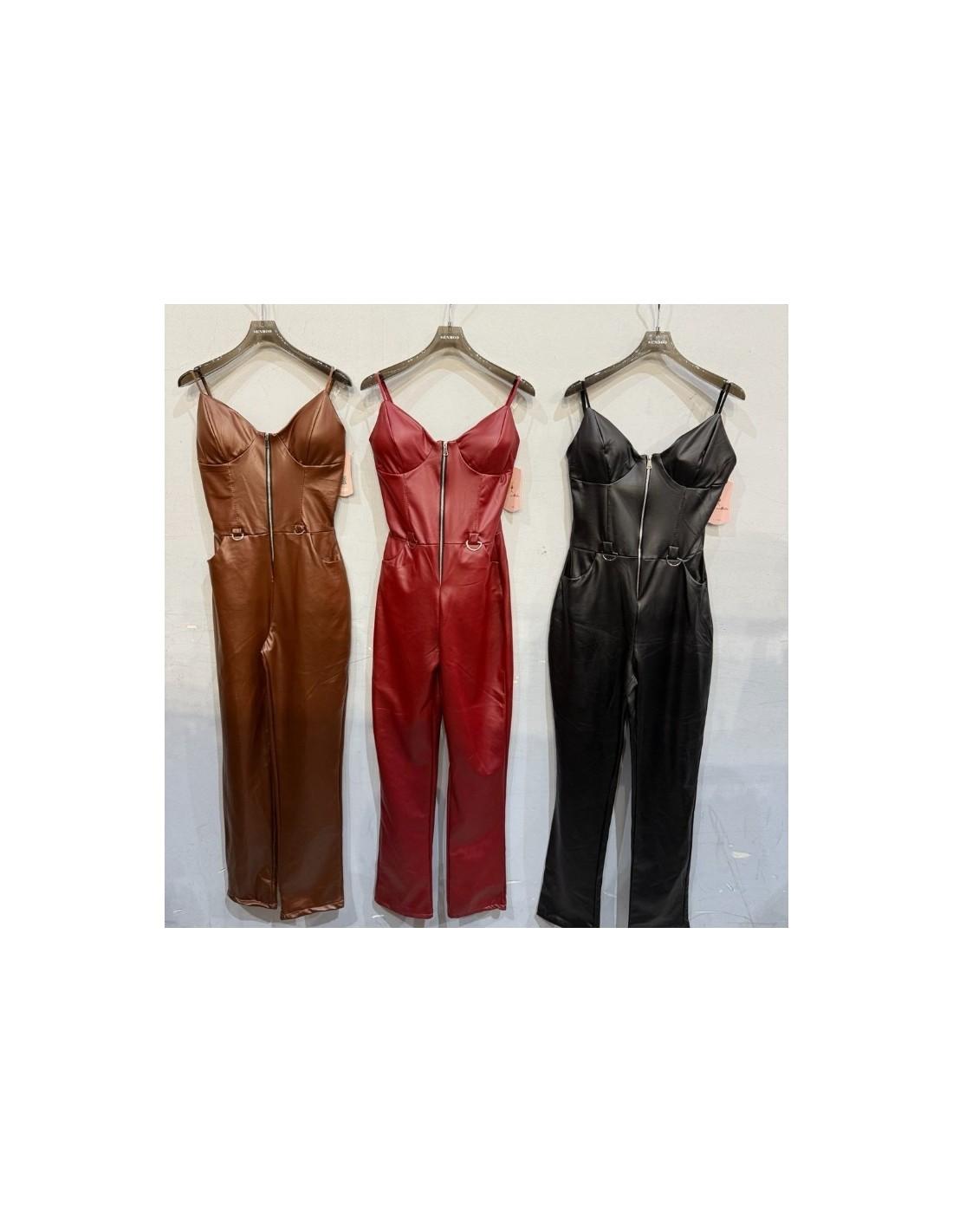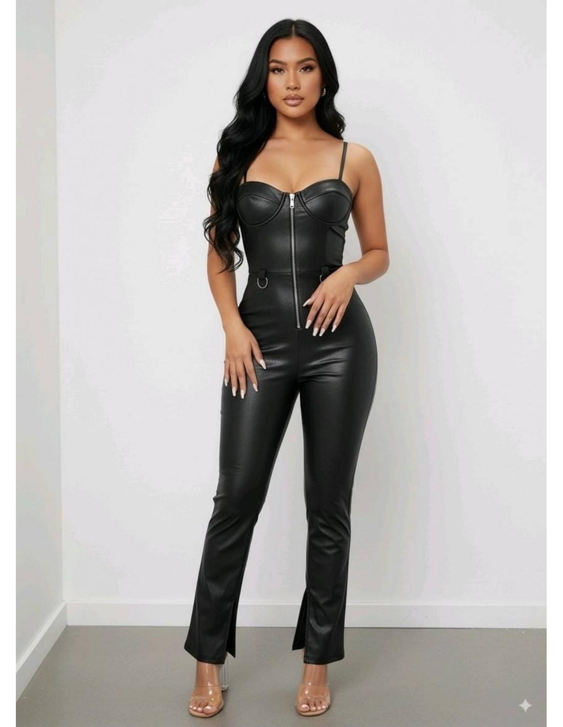 El mono que te hace sentir poderosa, sexy y peligrosa… pero con clase. De tirantes finos, escote con forma de corsé y cremallera frontal para que decidas tú el nivel de drama. Su efecto cuero ajusta donde tiene que ajustar y alarga las piernas como si llevases filtros de serie.