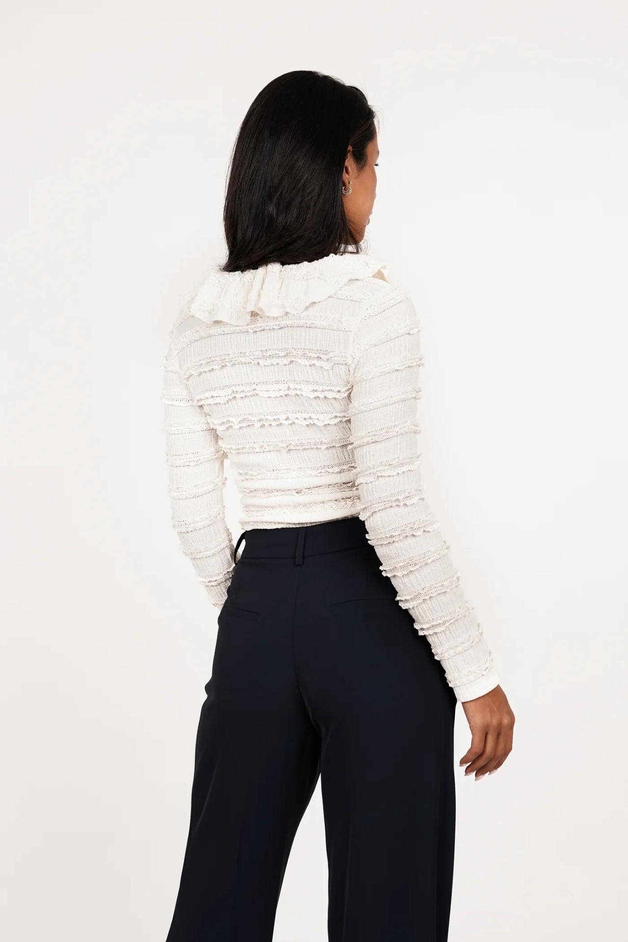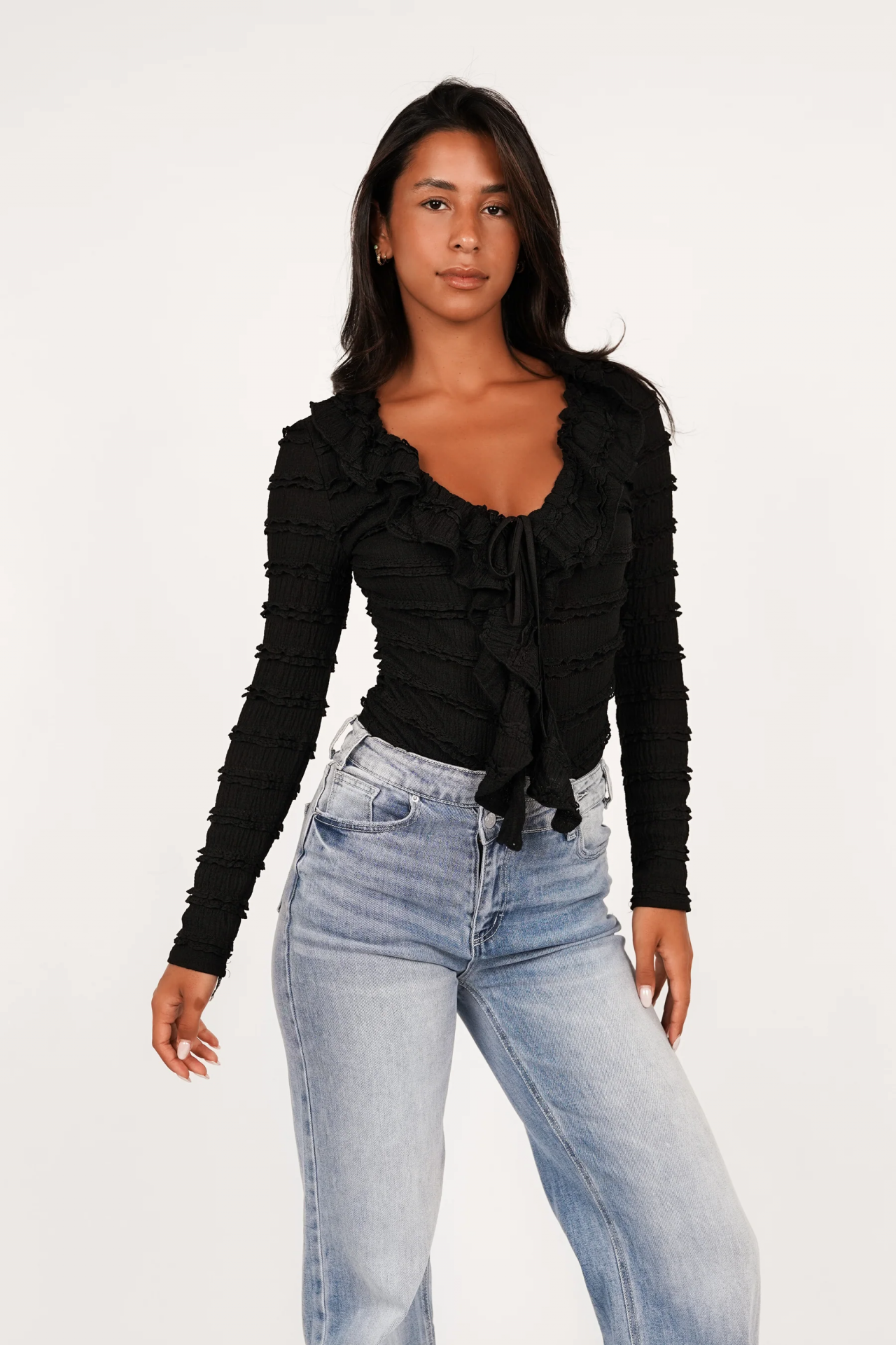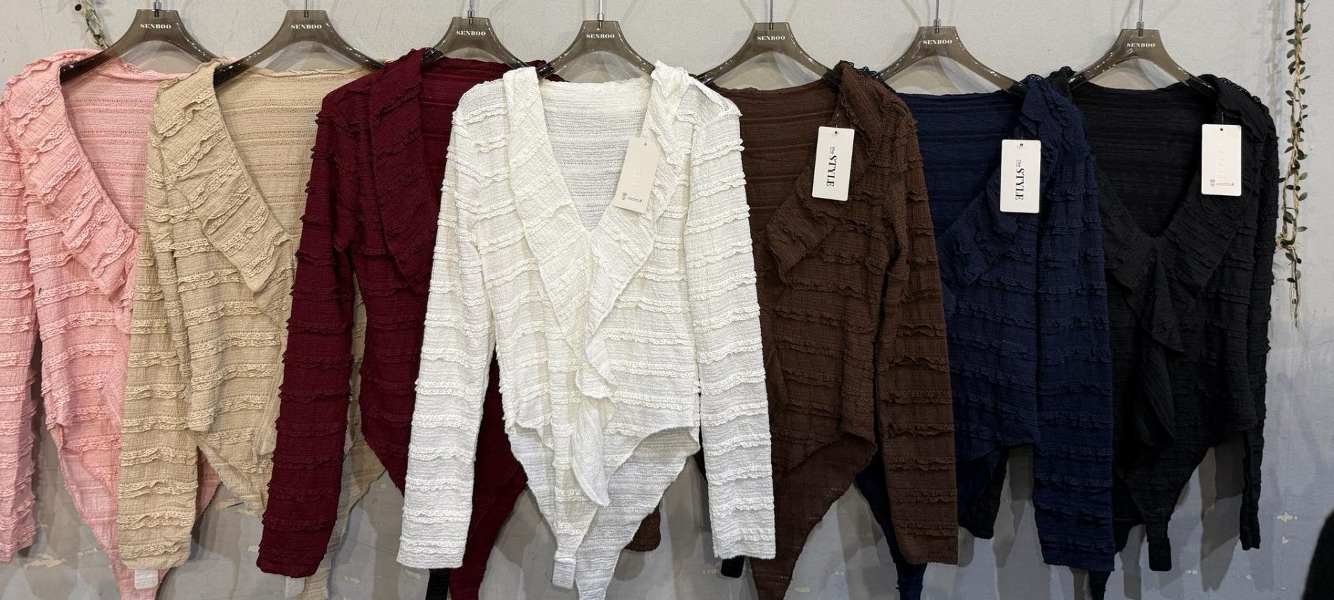 El body de volantes mujer que conquista sin esfuerzo. Su textura elástica se adapta al cuerpo y el escote con lazo añade ese toque romántico con carácter. Un básico reinventado con un sello inconfundible.