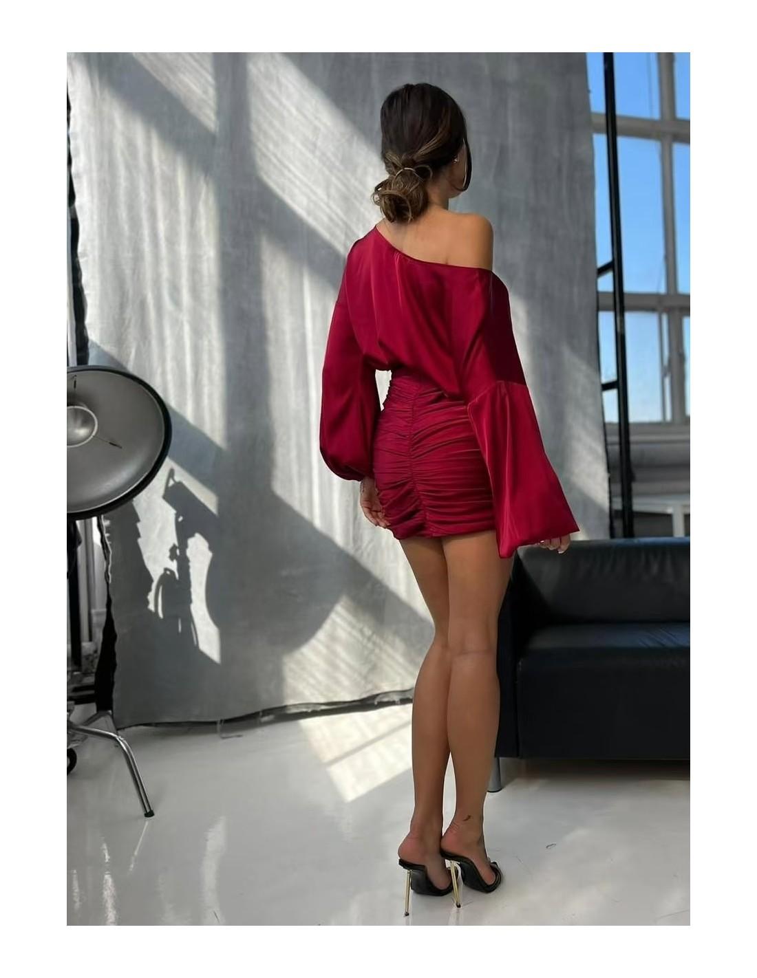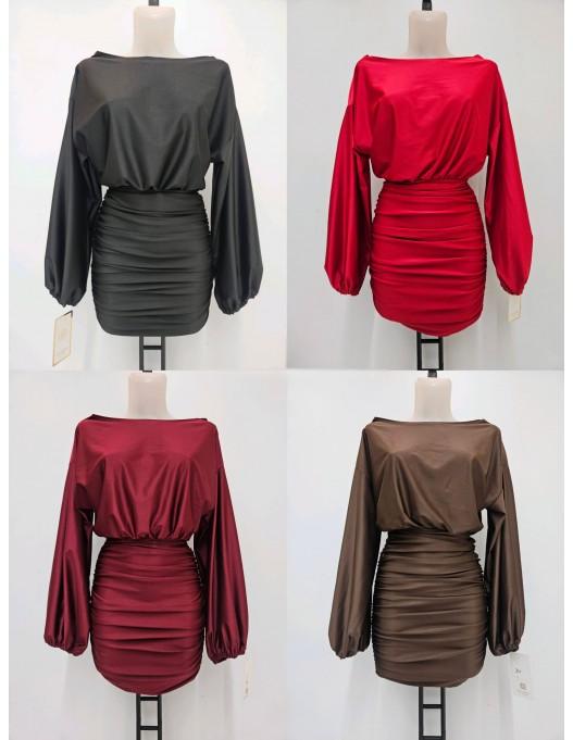 Vestido corto de licra con mangas abullonadas y escote barco. Ajustado en la cintura y con fruncido que estiliza todo. Ideal para noches intensas o días en los que decides ser la diva del lugar.