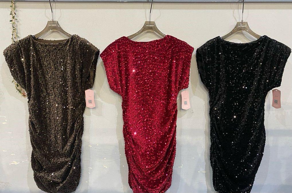 Vestido ajustado de terciopelo con lentejuelas que captan la luz desde cualquier ángulo. Tiene un diseño drapeado que se adapta al cuerpo y resalta la figura sin marcar. Los hombros estructurados le dan ese toque potente y elegante que transforma cualquier plan.