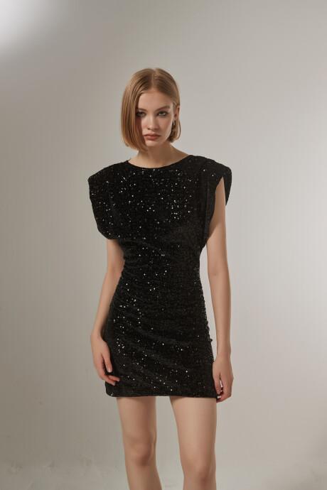 Vestido corto de terciopelo con lentejuelas, hombros marcados y caída drapeada. Brilla sin esfuerzo, de noche o de día.