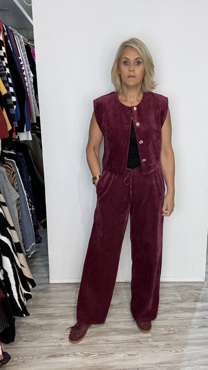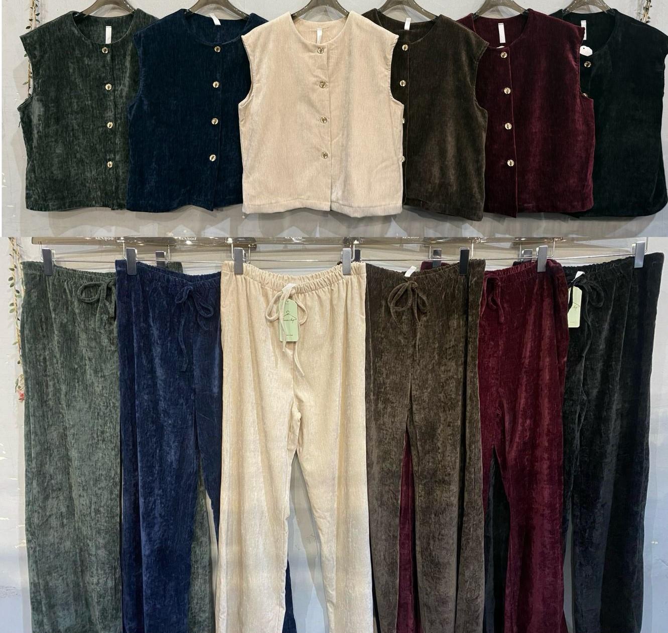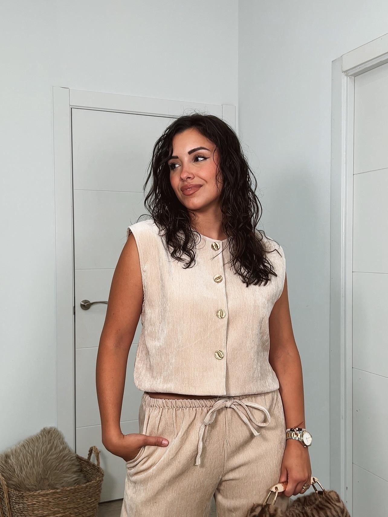 Conjunto de pana ligera con top abotonado y pantalón fluido. Suave, cómodo y con mucho estilo.