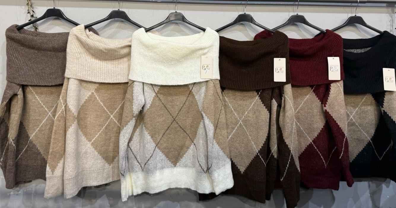 Jersey de rombos con cuello caído. Suave, elegante y con un toque muy chic.