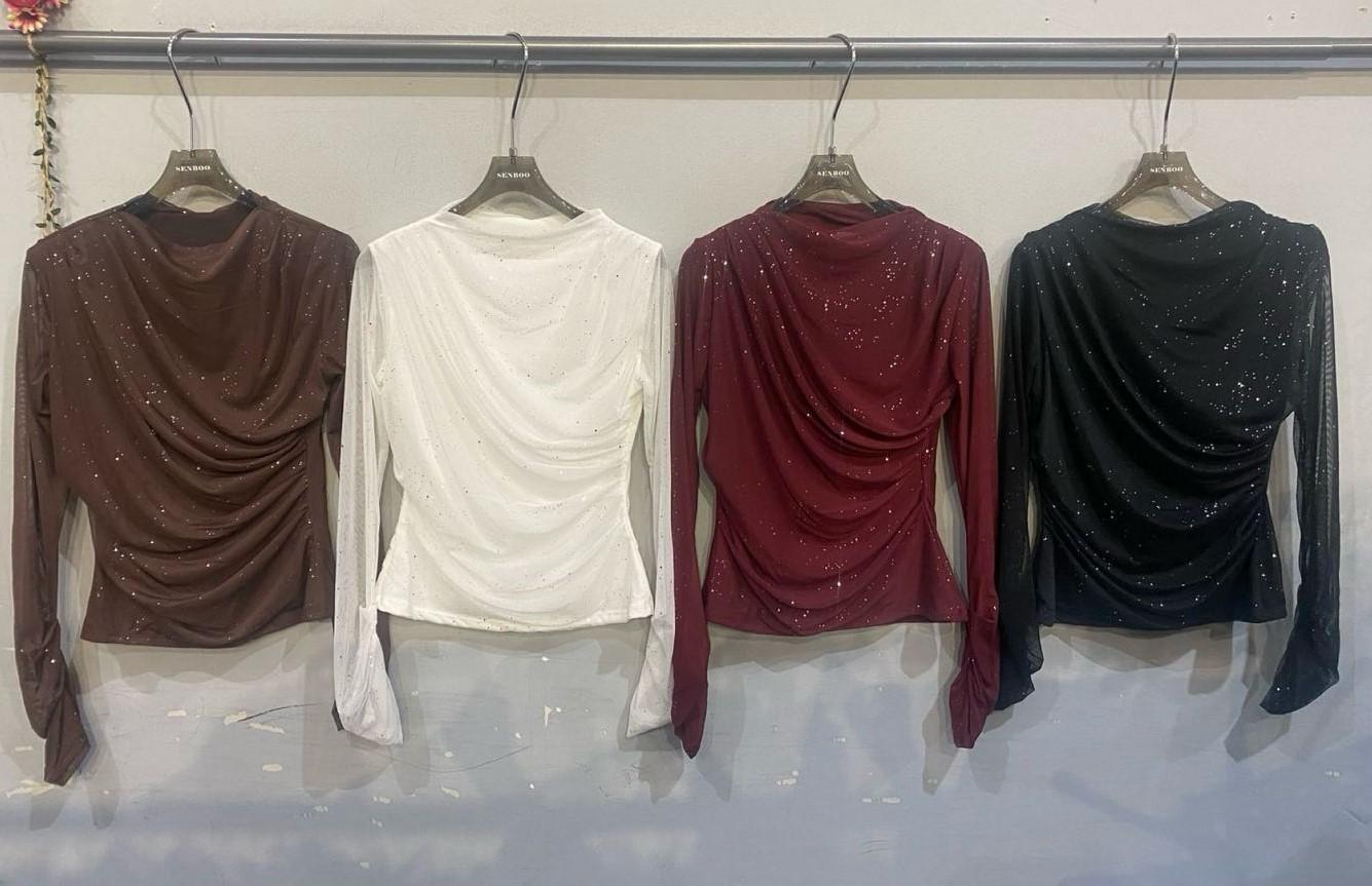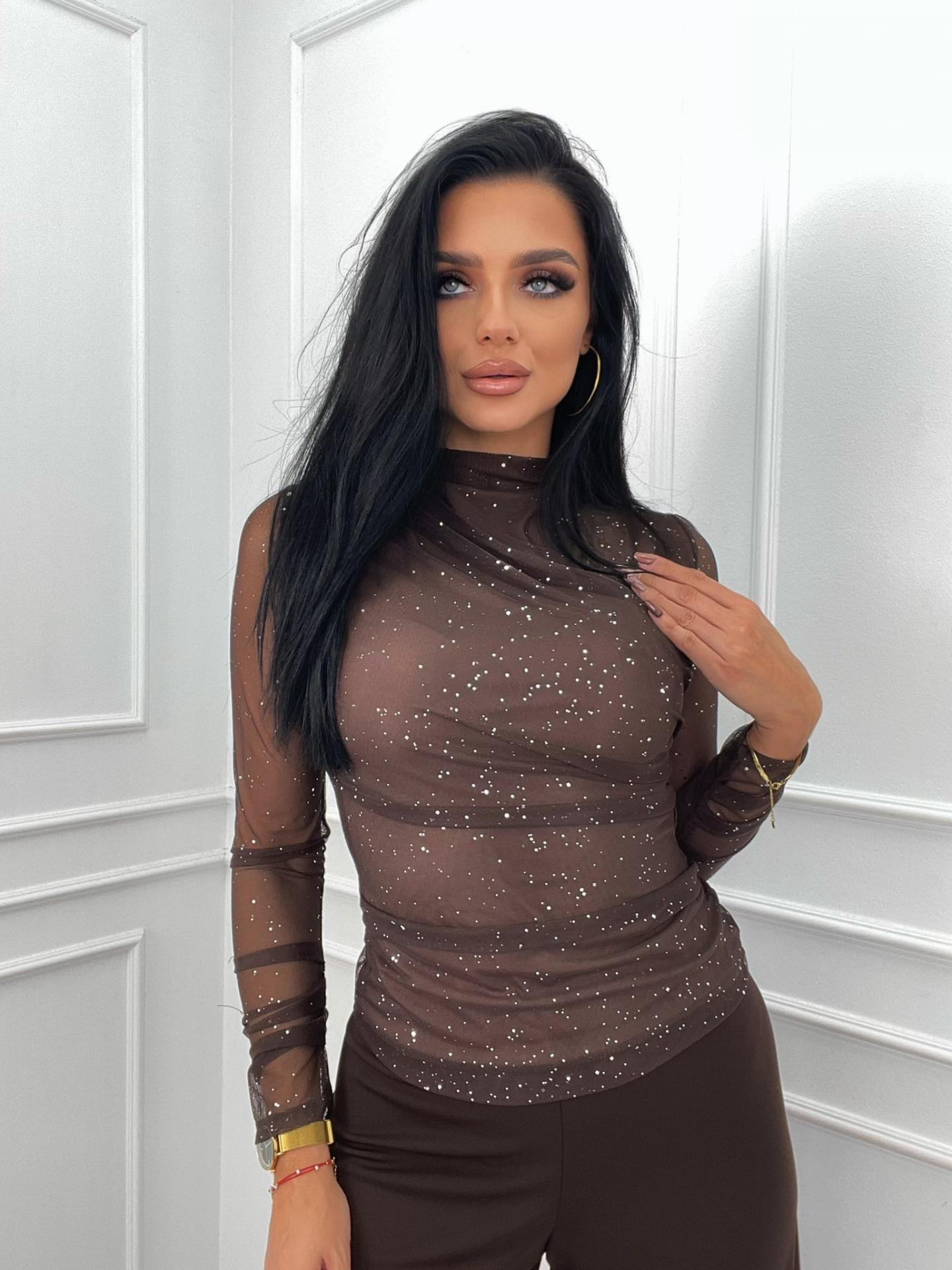 Esta blusa de tul con brillantes es la mezcla perfecta entre delicadeza y fuerza. Su tejido semitransparente con destellos crea un efecto sofisticado que eleva cualquier look sin esfuerzo.