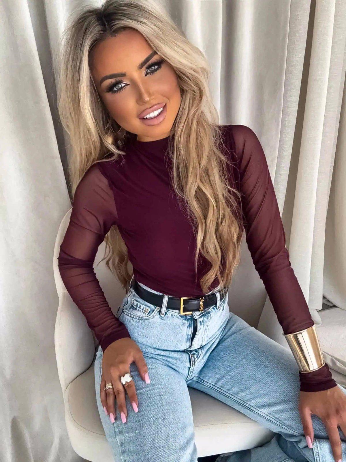 Tiene las mangas de tul transparentes que te hacen sentir poderosa sin enseñar demasiado, y un cuerpo ajustado que marca justo lo necesario. El equilibrio perfecto entre “voy elegante” y “sé perfectamente lo que hago”.