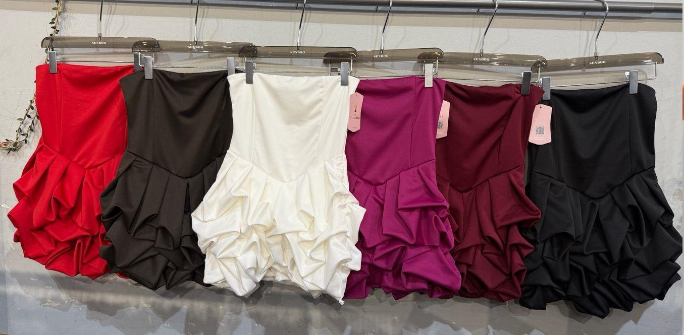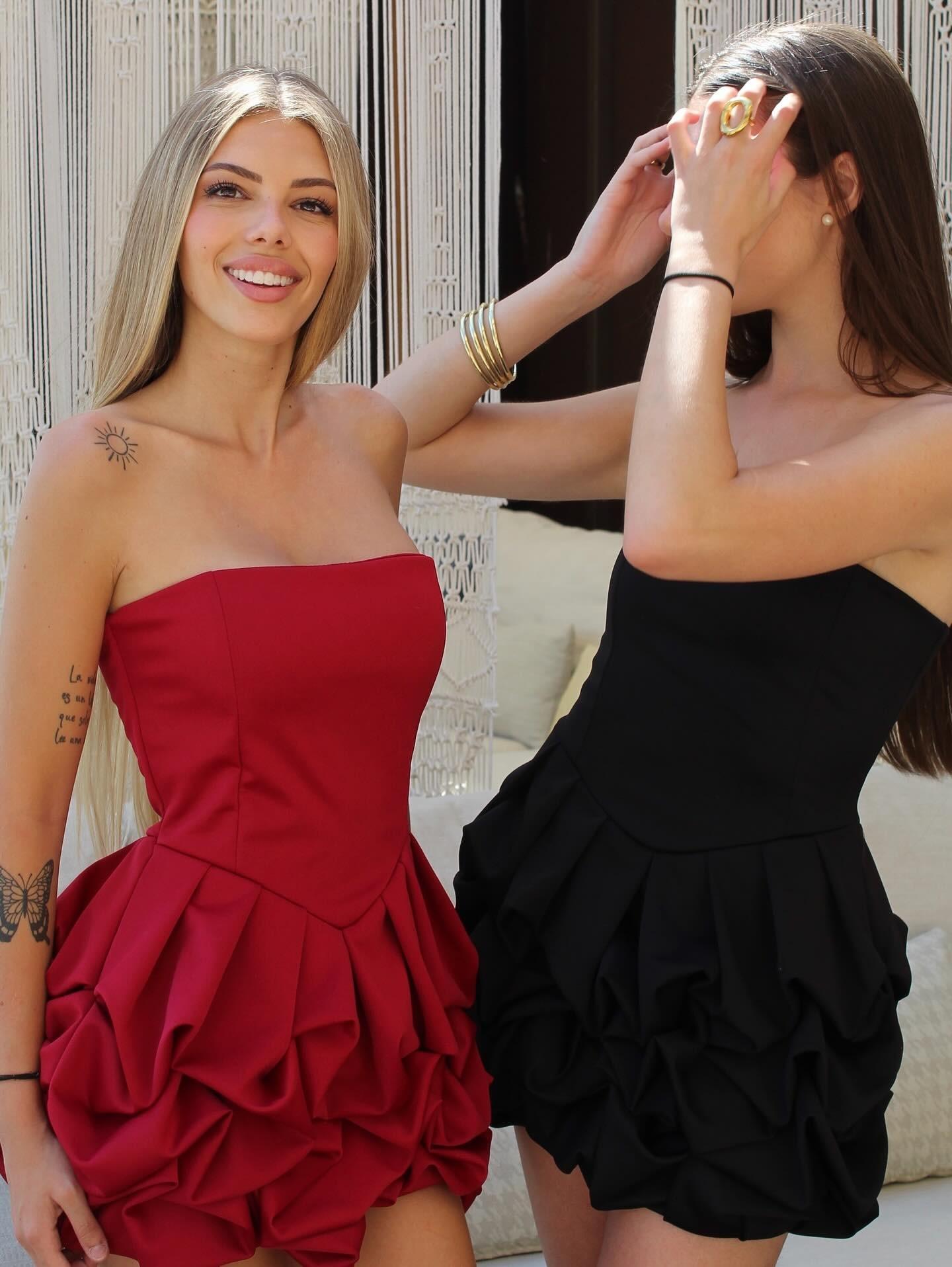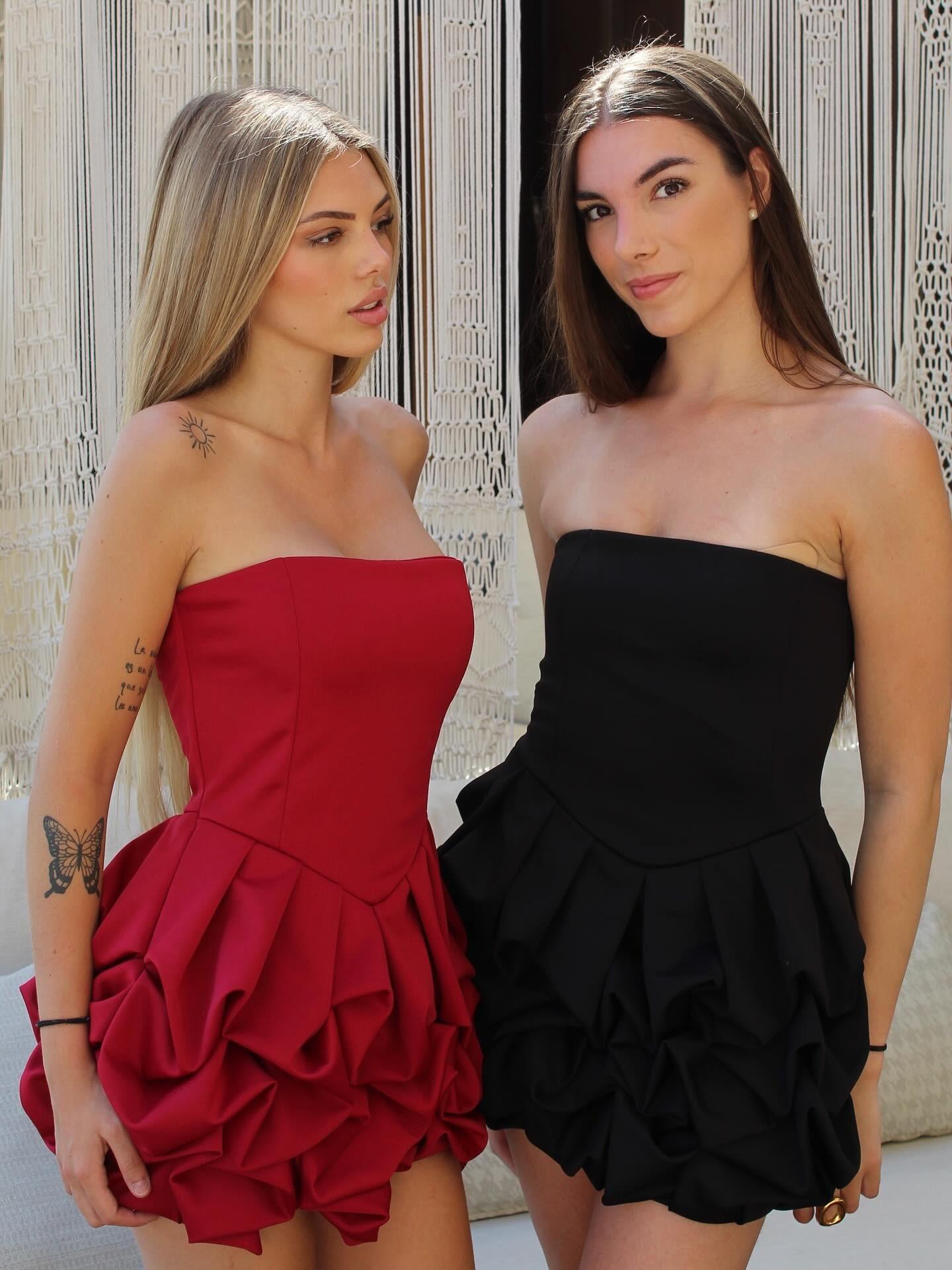 Corto, palabra de honor y con una falda de volantes que parece diseñada para robar protagonismo en cada foto (y en cada mirada). Marca cintura, alarga piernas y convierte cualquier entrada en una alfombra roja improvisada.