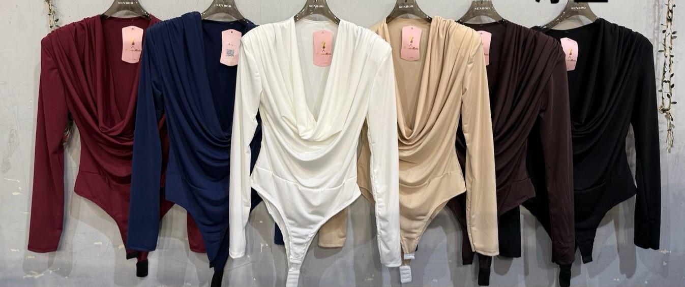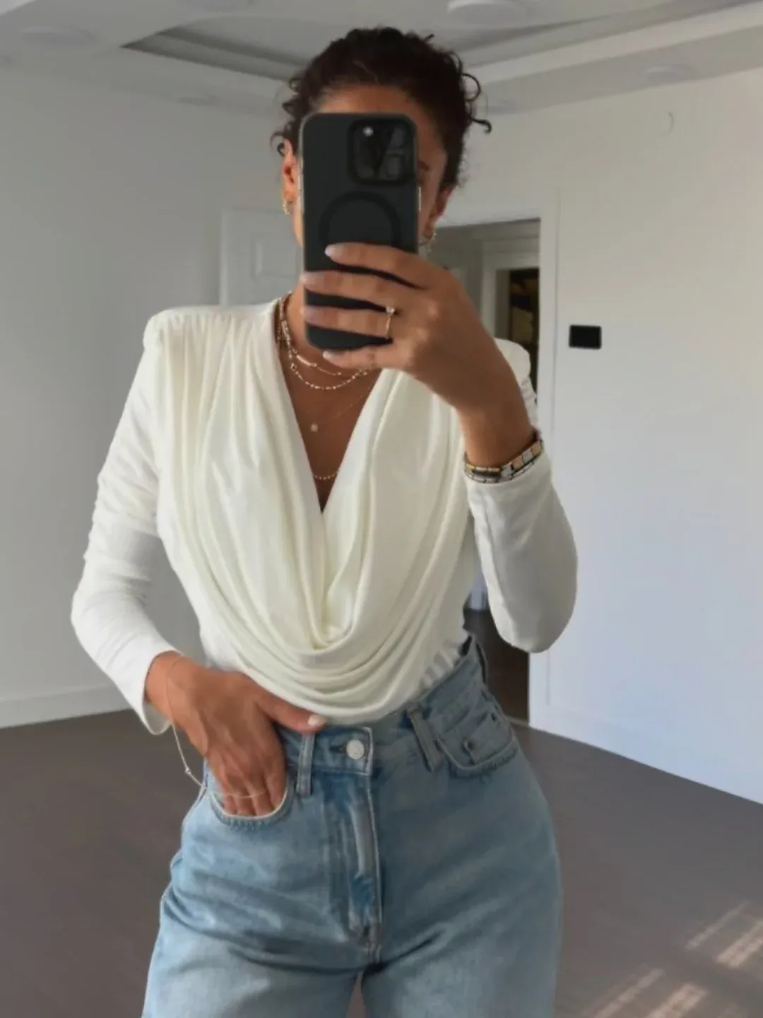 Body drapeado de licra con escote profundo. Sofisticado, cómodo y peligrosamente favorecedor.