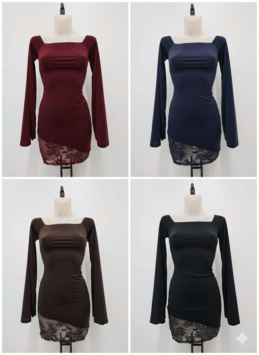 De corte ajustado y escote recto, combina el toque sofisticado del cuello cuadrado con el guiño atrevido de una falda asimétrica con encaje transparente.