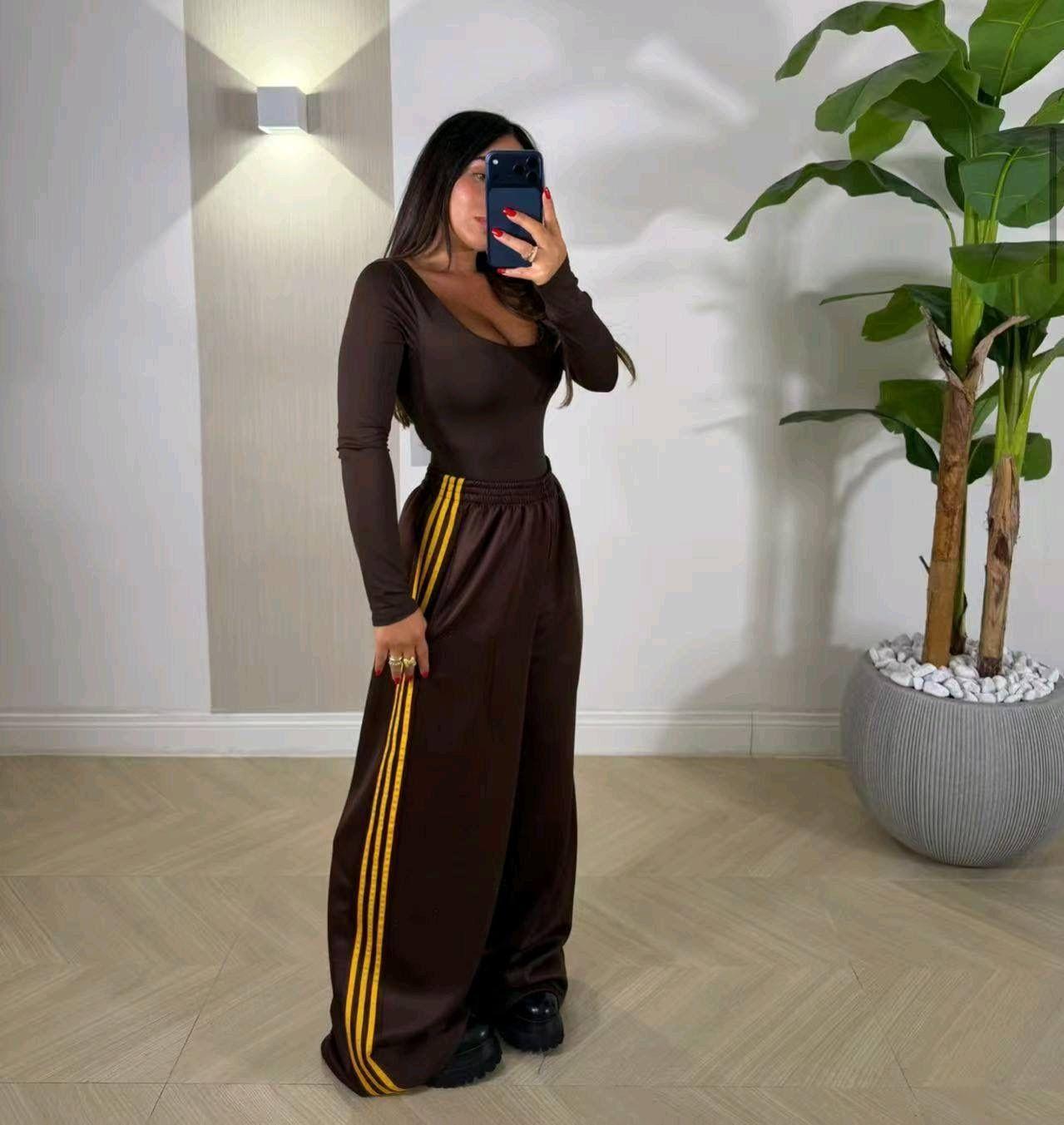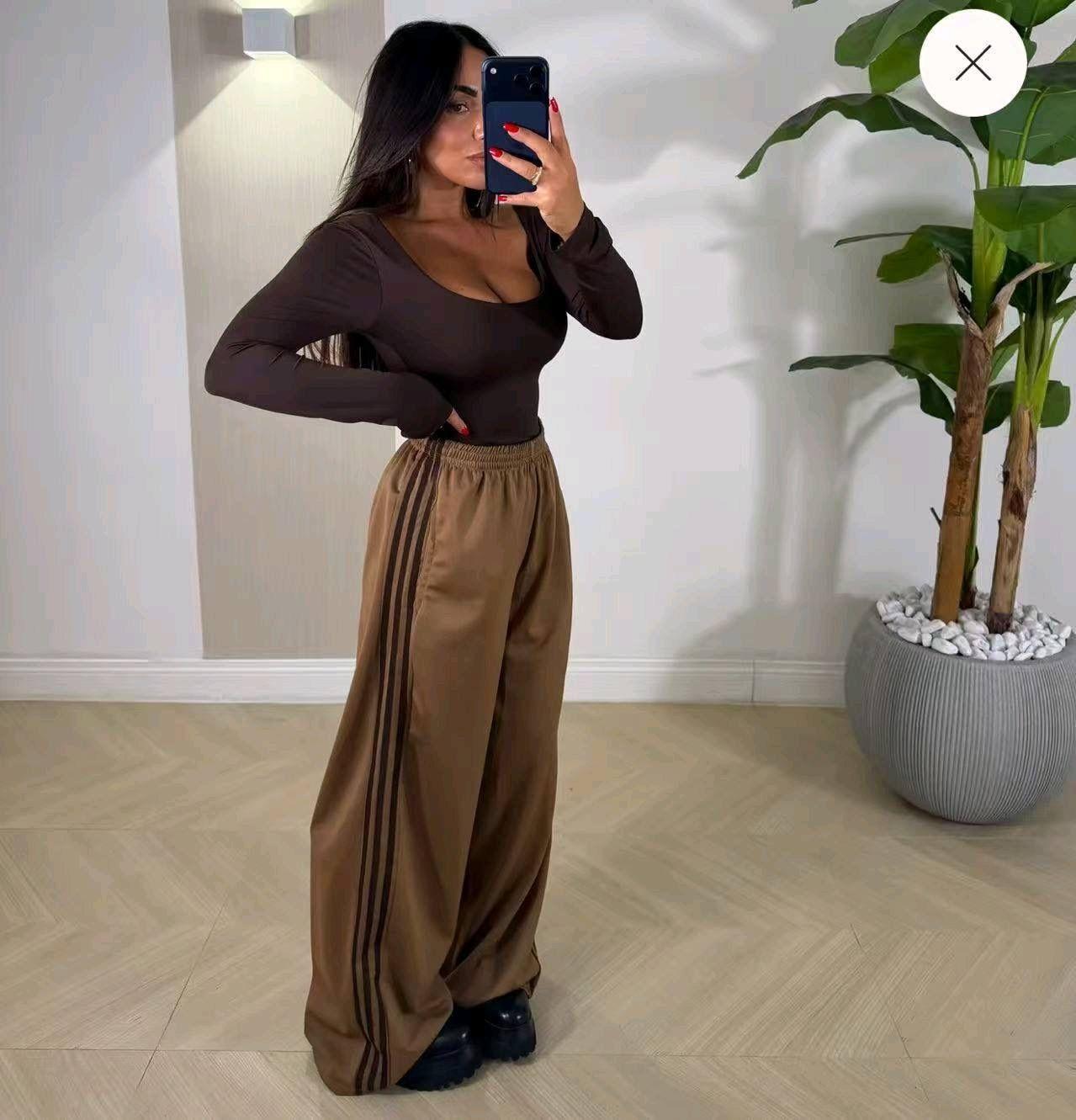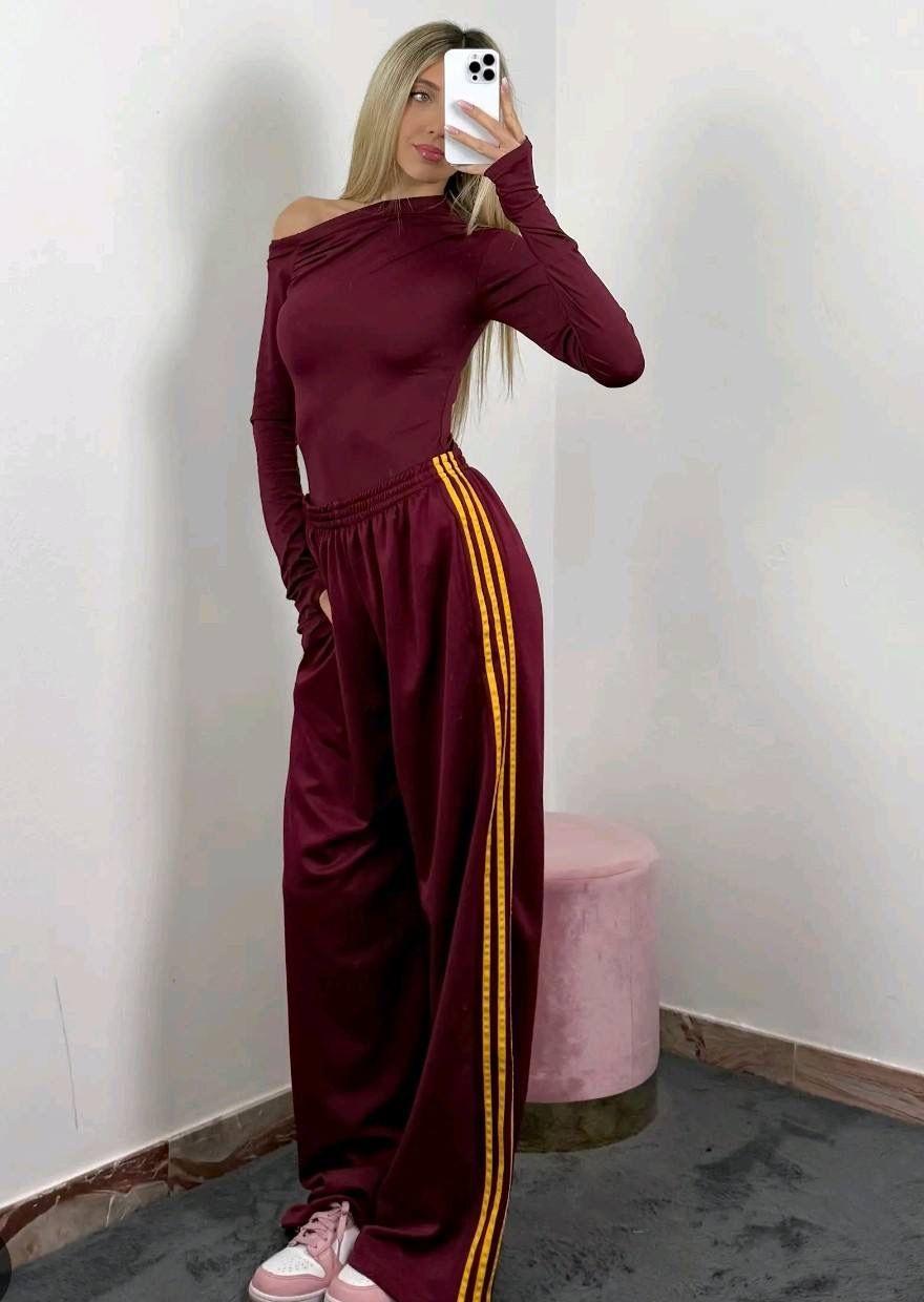 Pantalón satinado wide leg con franjas laterales. Cómodo, moderno y con un toque de lujo deportivo.