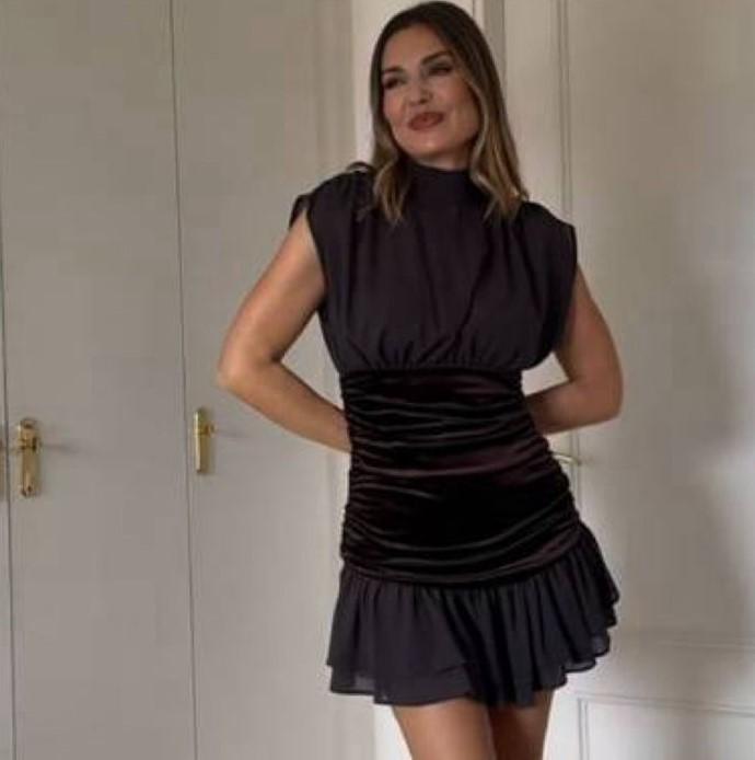 Vestido corto combinado con cuerpo fluido, cintura de terciopelo fruncido y falda con volante. Sienta de maravilla y marca la figura sin apretar.