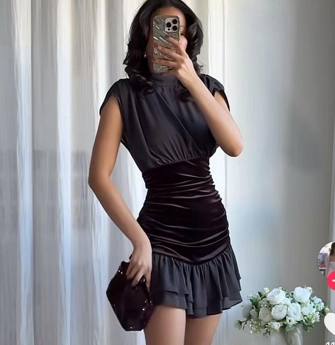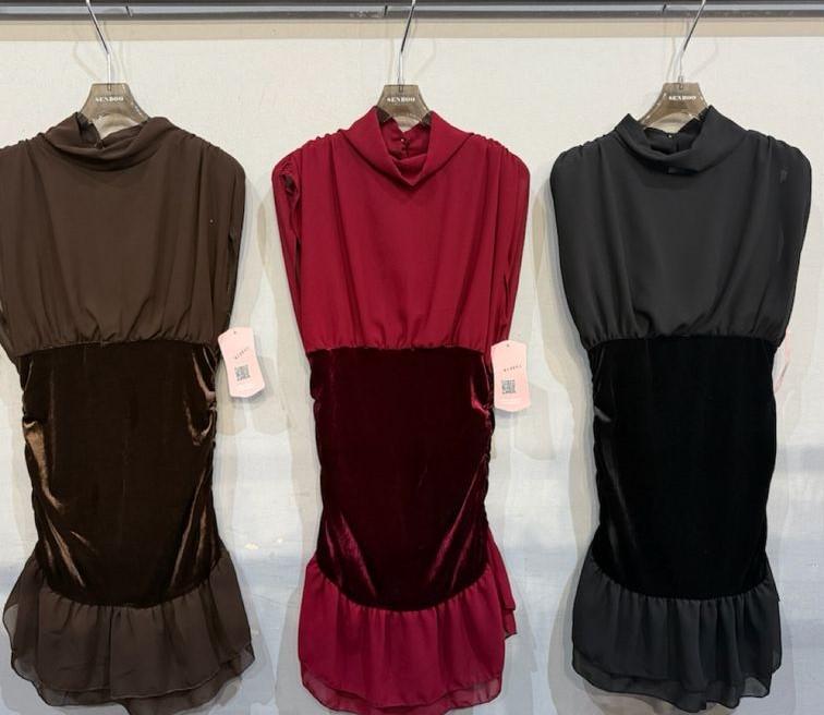 Este vestido corto mezcla dos tejidos para crear una silueta espectacular: cuerpo fluido con caída suave y cintura fruncida en terciopelo que marca la figura de forma natural. El contraste de texturas estiliza, recoge donde toca y aporta un efecto visual muy favorecedor.