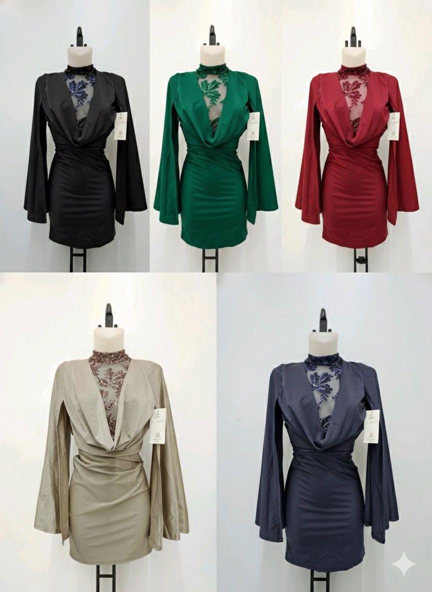 Vestido corto de fiesta con cuello alto bordado y aplicaciones brillantes sobre tul transparente, creando un efecto elegante y sofisticado. Lleva un escote drapeado que cae suavemente por delante y mangas tipo capa que aportan movimiento y un toque de drama. El tejido es elástico, se adapta al cuerpo y realza la figura sin perder comodidad. Ideal para eventos, cenas especiales, Navidad o cualquier ocasión donde quieras destacar.