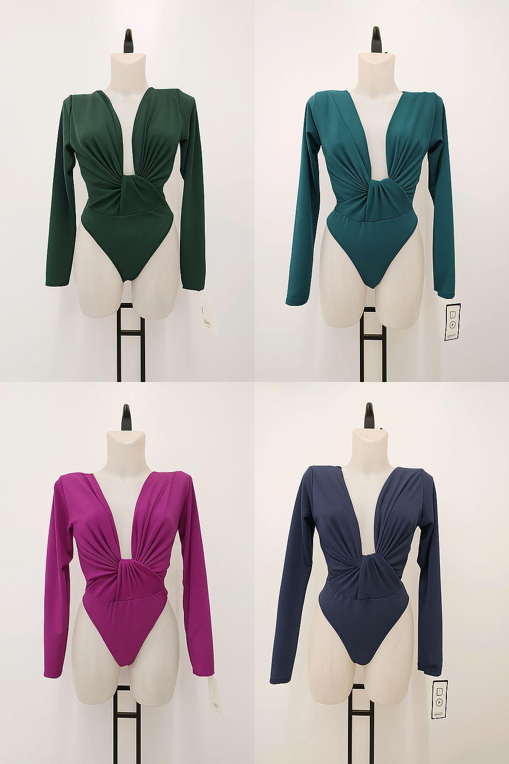 Body drapeado con escote profundo y manga larga. Favorece, estiliza y combina con cualquier look de noche.