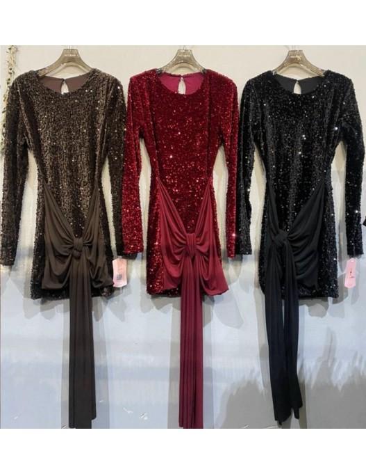 Vestido de lentejuelas con lazo frontal, manga larga y caída elegante. Favorece, estiliza y brilla sin exageraciones. Perfecto para ocasiones especiales.