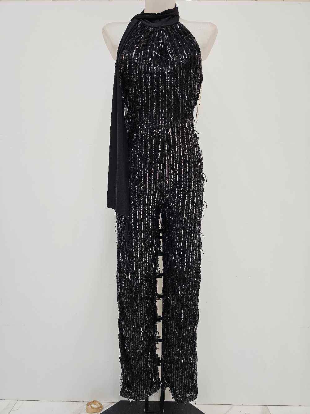 Mono de lentejuelas con cuello halter y caída recta. Elegante, favorecedor y perfecto para noches especiales.