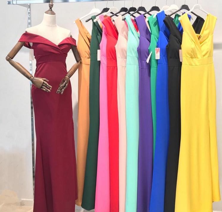 Vestido de invitada largo de Poliester Denim y Algodón. Cremallera trasera ajustable. Tirantes plegables con posibilidad de varias posiciones.