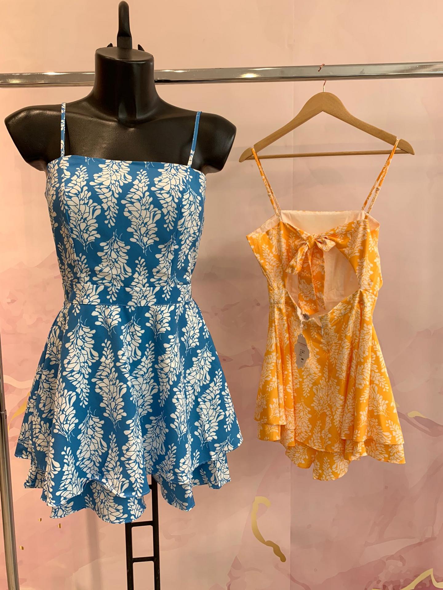 Mono corto efecto vestido con tirantes regulables, cremallera invisible en la parte de la falda y lazada en la parte alta de la espalda. Es de un tejido muy fresco que apenas se arruga.