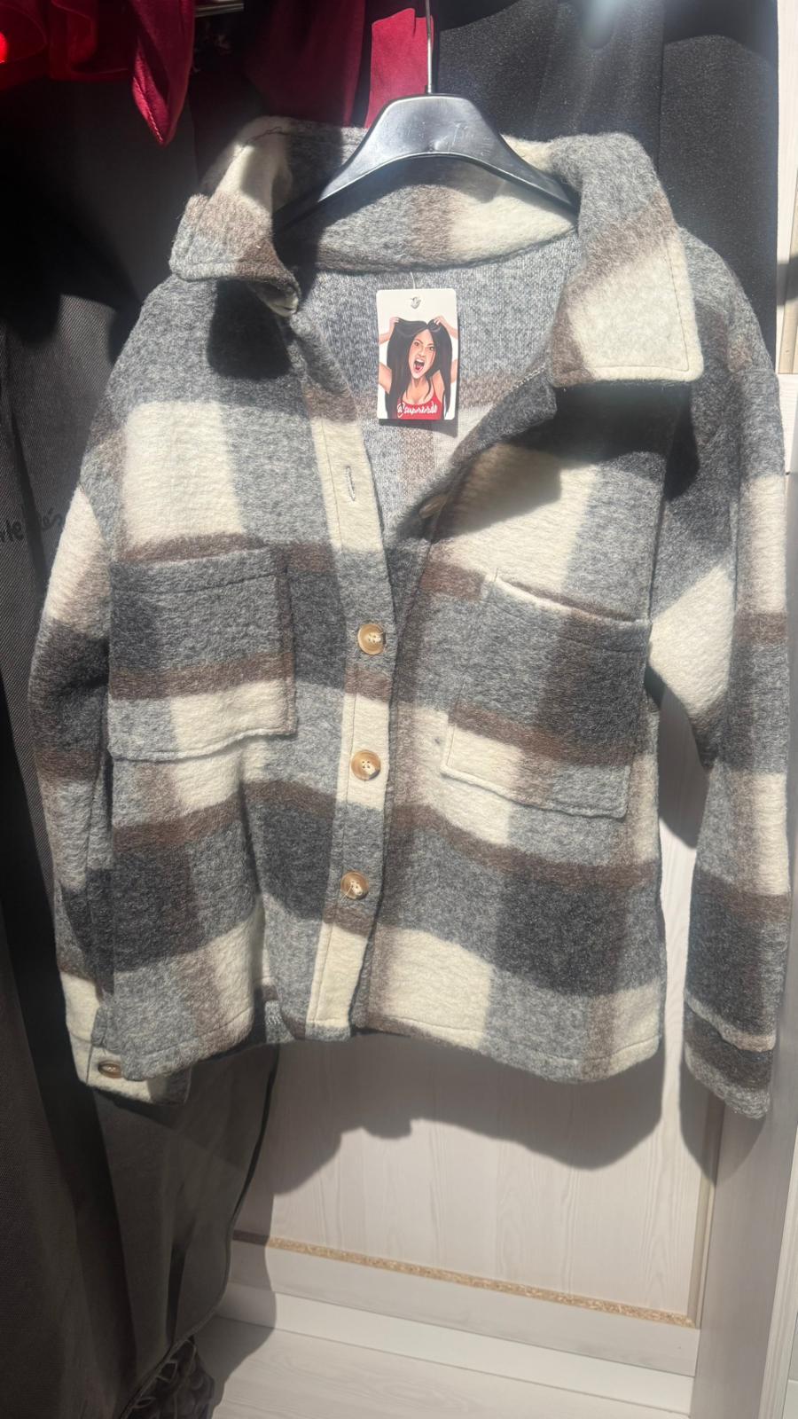 Sobrecamisa gris de cuadros con corte amplio y tejido suave. Perfecta para entretiempo o días fríos con estilo.
