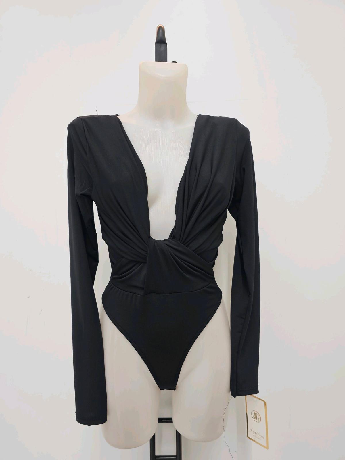 Body drapeado con escote profundo y manga larga. Favorece, estiliza y combina con cualquier look de noche.