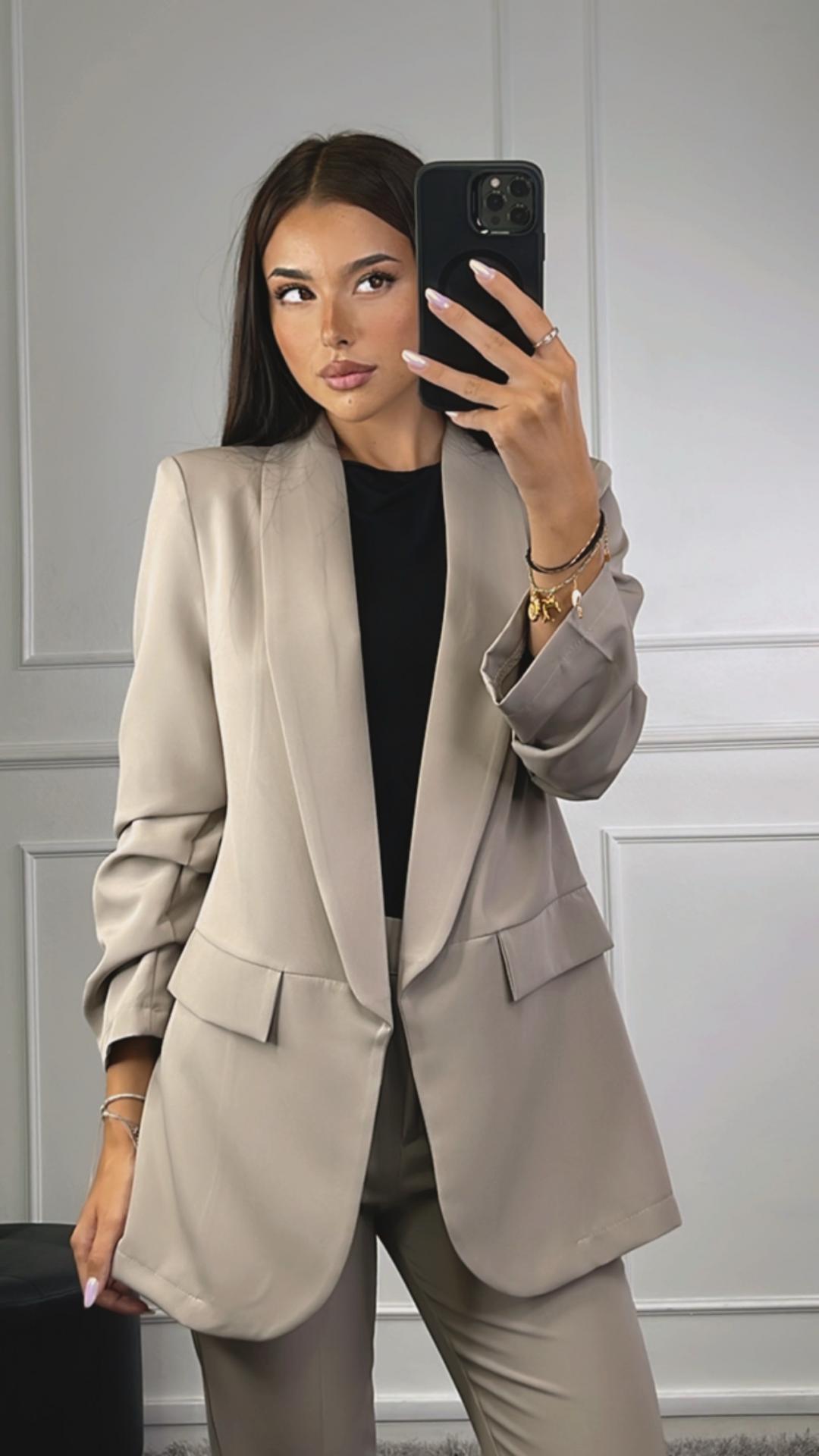 Americana fluida de corte recto con puños fruncidos, ligera, favorecedora y combinable con cualquier look.