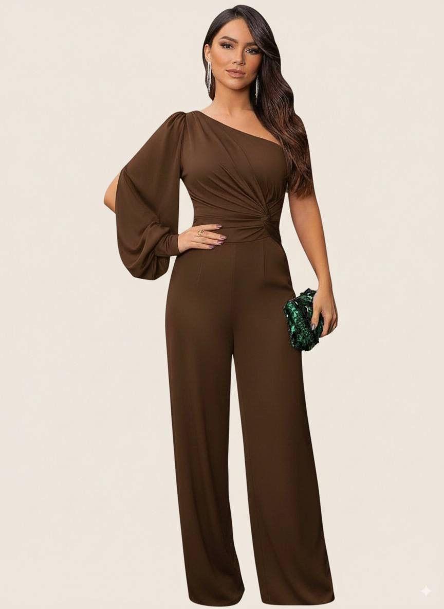 Mono satinado asimétrico de fiesta con manga globo, drapeado en la cintura y pernera ancha. Elegante, favorecedor y muy cómodo para eventos.