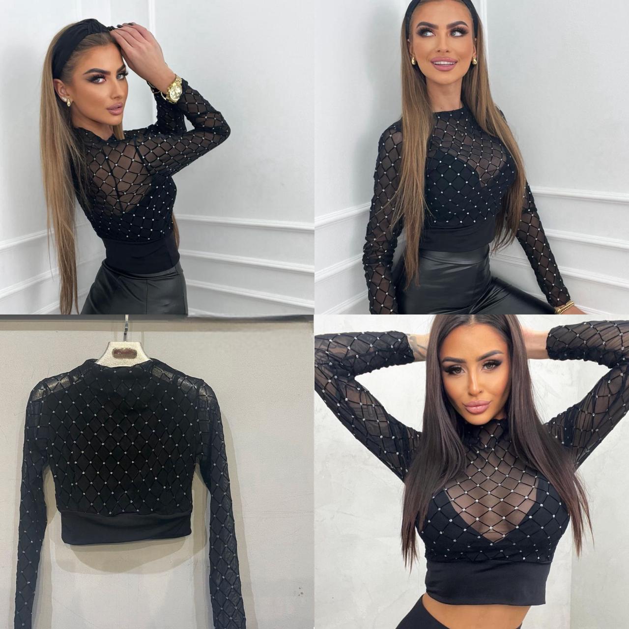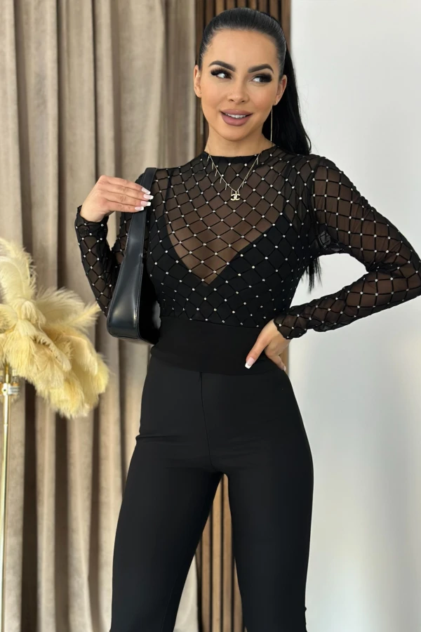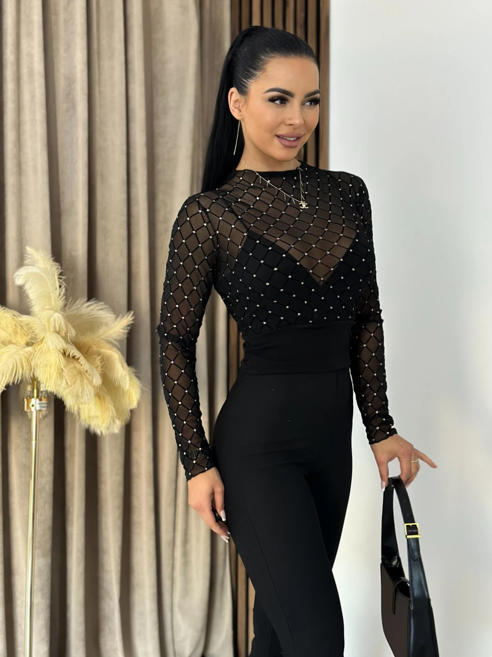Confeccionado en tul negro elástico, juega con una malla geométrica decorada con piedrecitas brillantes que captan la luz sin pedir permiso. La parte delantera combina transparencia sexy con un cuerpo ajustado que recoge, estiliza y remarca cintura… un combo ganador.