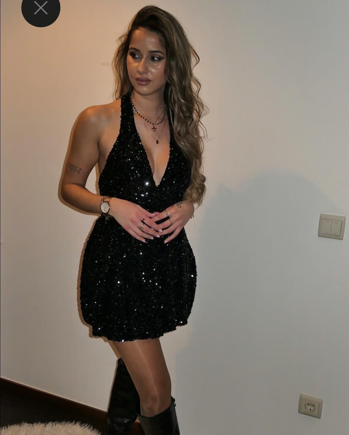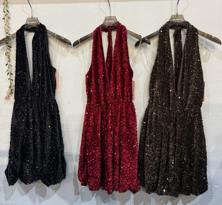 Vestido corto de terciopelo con lentejuelas, escote halter y espalda descubierta. Brillante, favorecedor y perfecto para tus noches especiales.