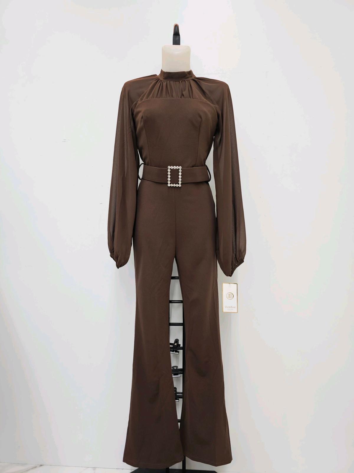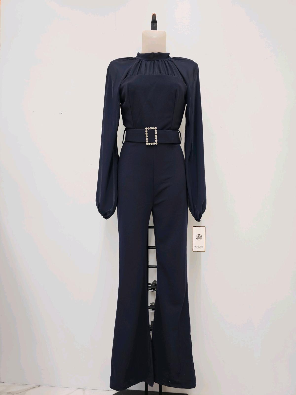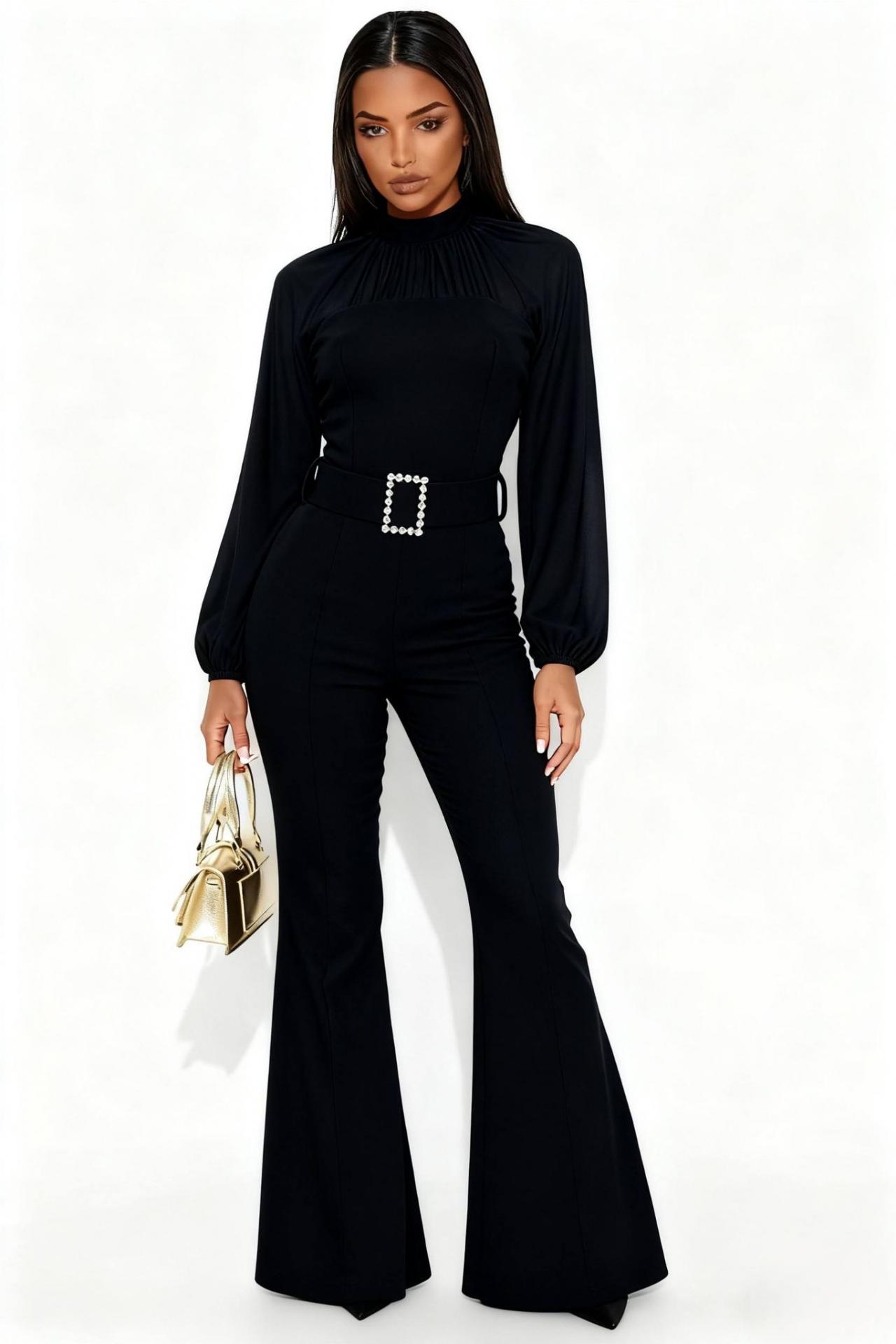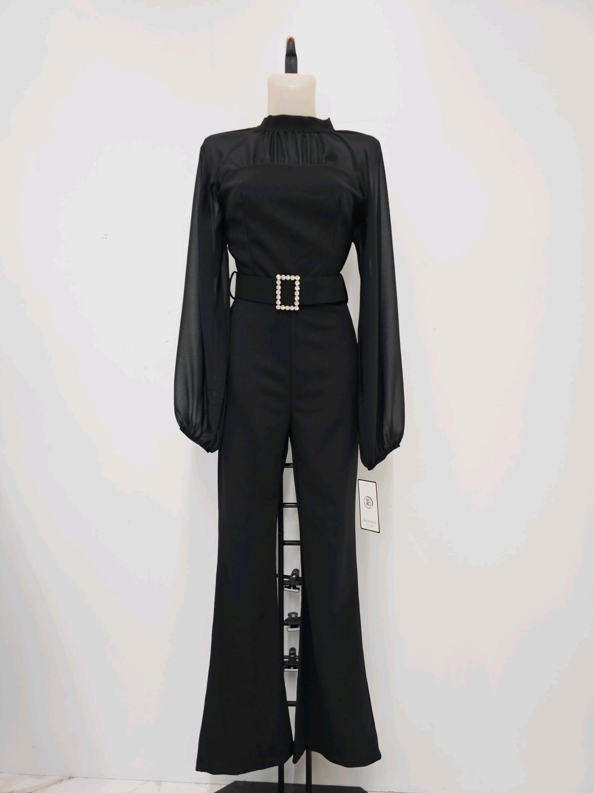 Mono elegante de fiesta con mangas abullonadas y cinturón con hebilla de perlas. Favorecedor, sofisticado y de tejido grueso con caída perfecta.