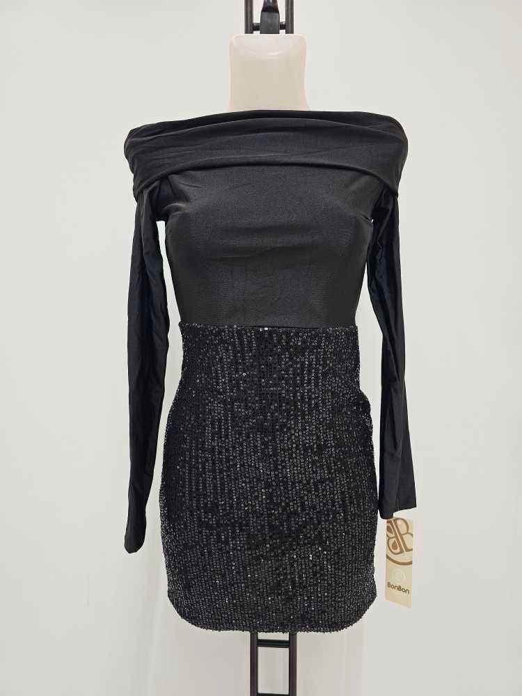 Vestido mini de invierno de una sola pieza con escote bardot, mangas largas y falda de lentejuelas integrada.