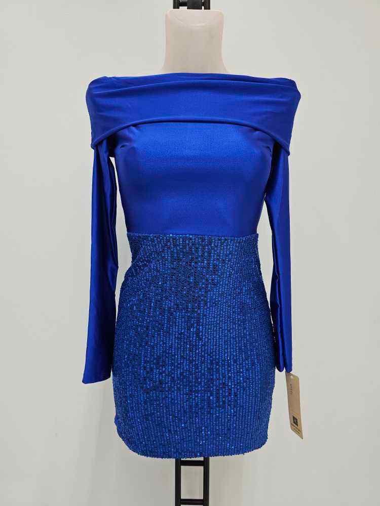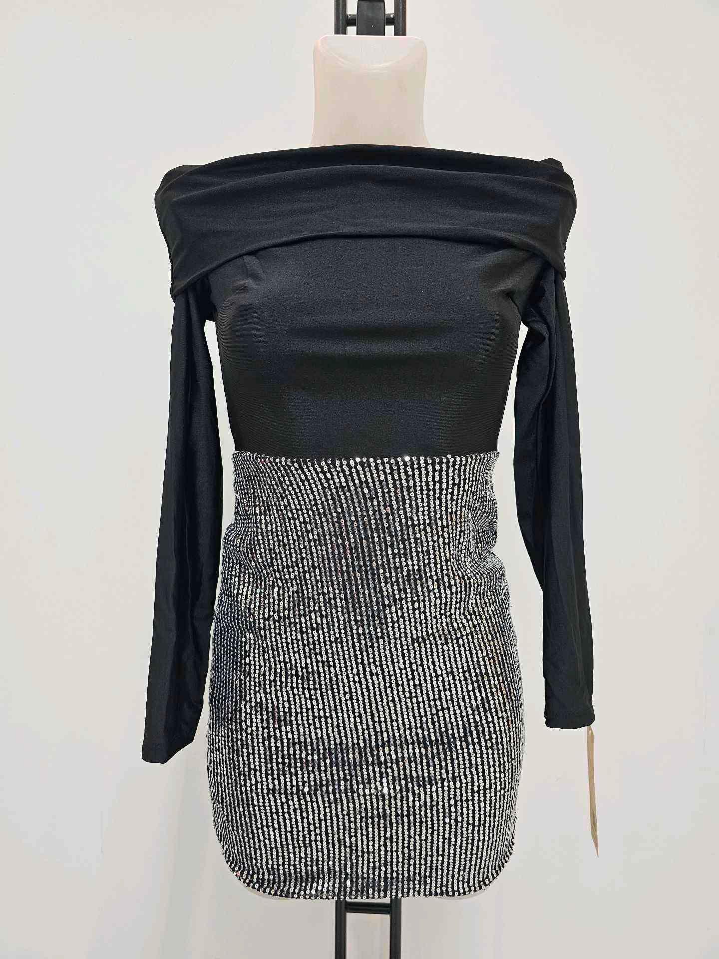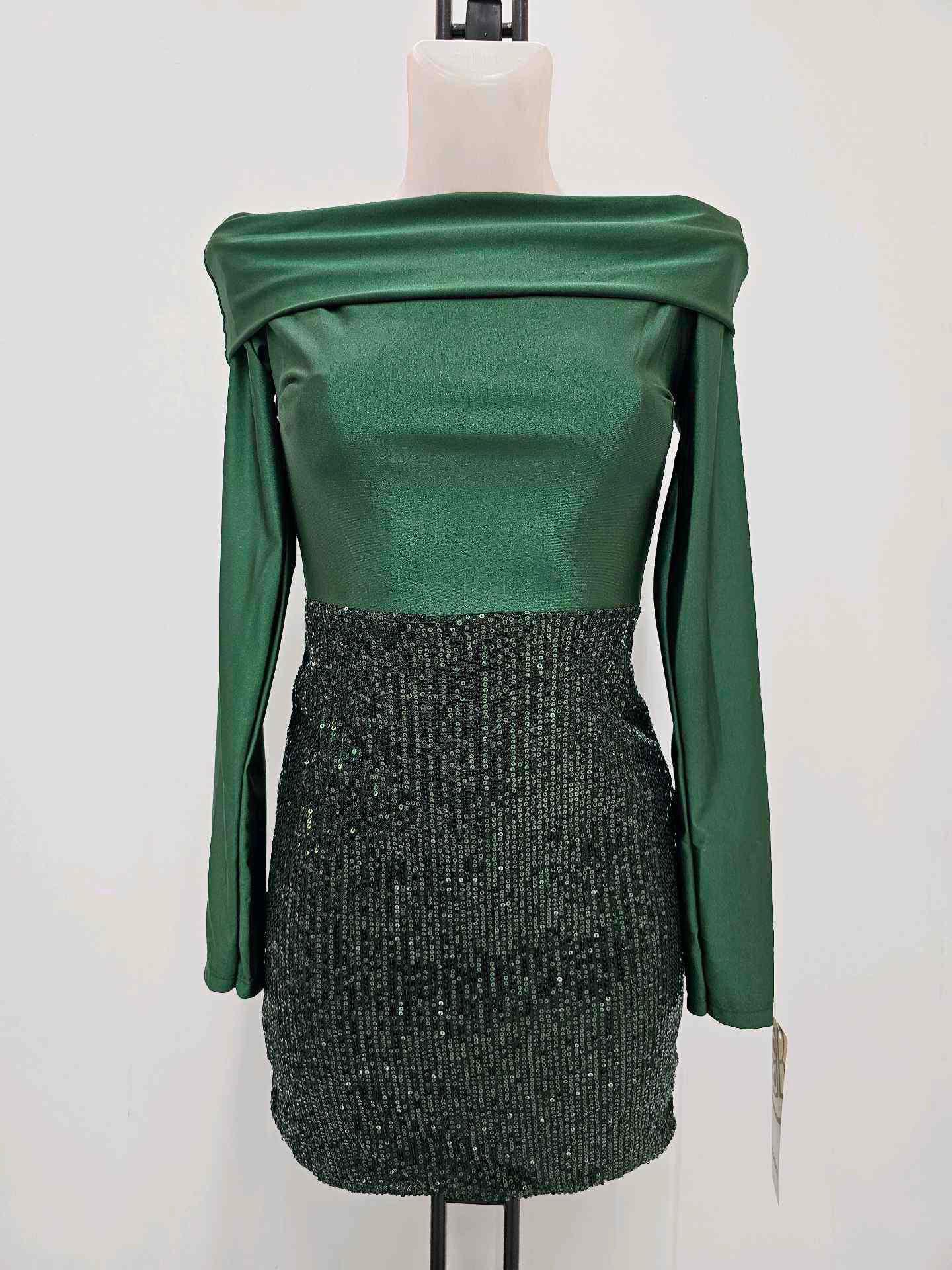 La parte superior, de corte ajustado, realza la silueta y aporta un aire femenino y actual, mientras que las mangas largas equilibran el look y lo hacen perfecto para climas más fríos. La falda mini de lentejuelas añade el punto protagonista del vestido, aportando luminosidad y un acabado especial ideal para noches, cenas, fiestas o eventos.