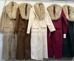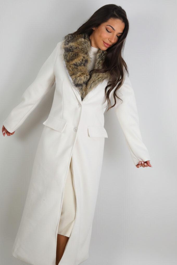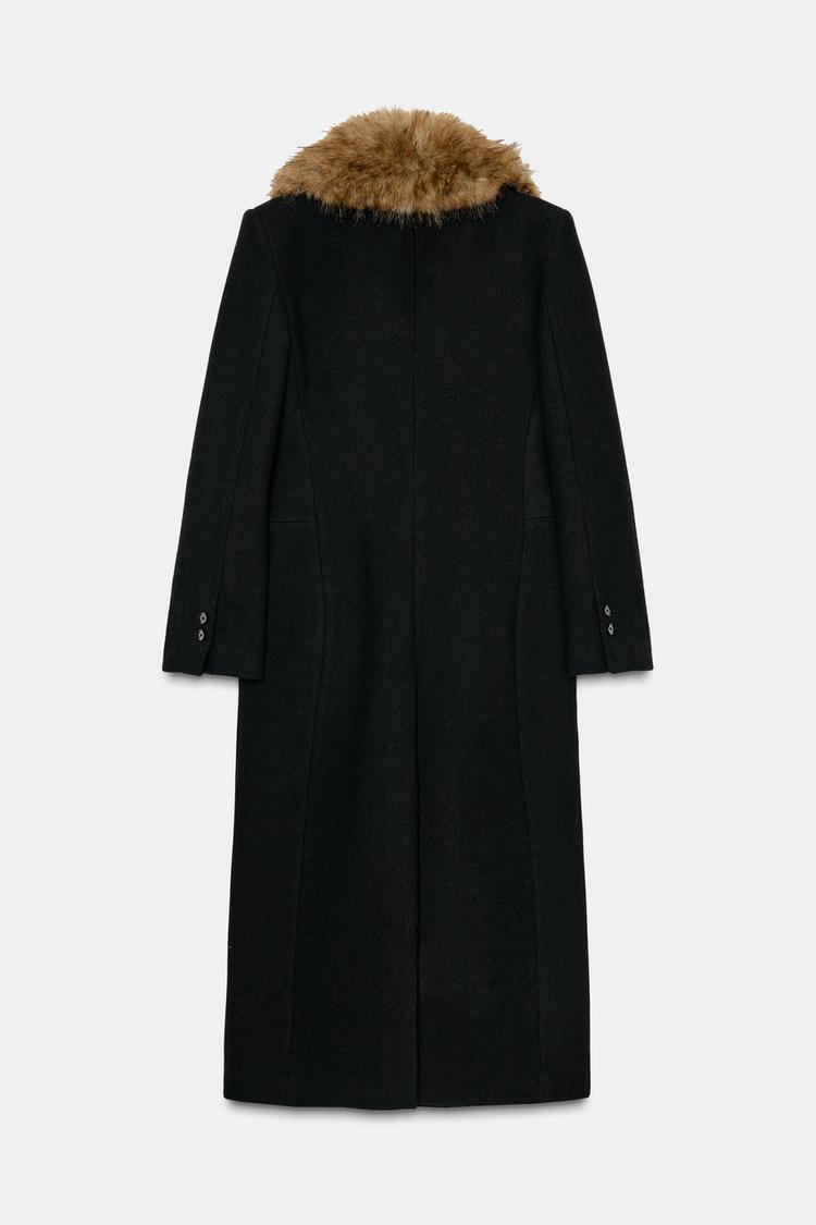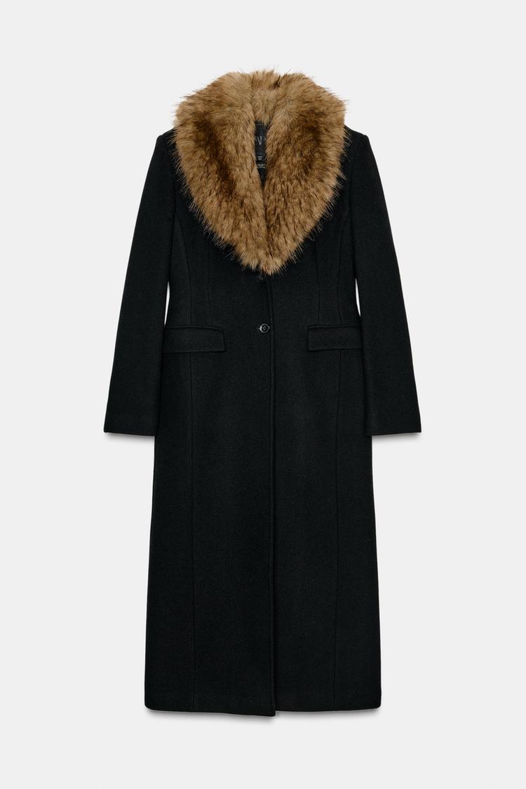Abrigo largo de invierno con cuello efecto pelo y corte recto elegante.