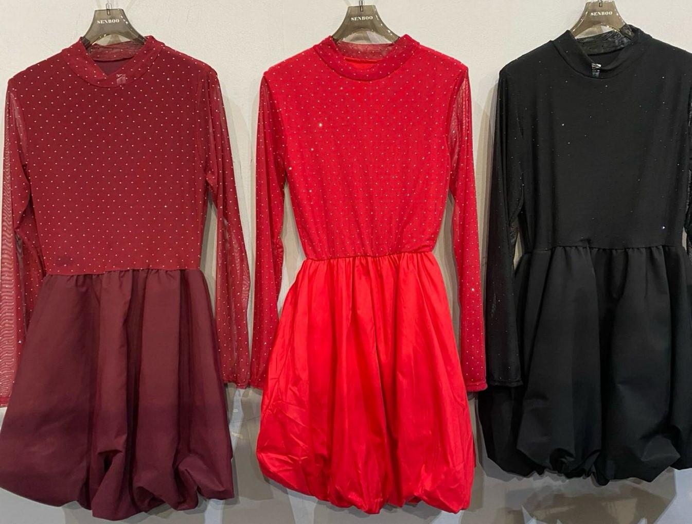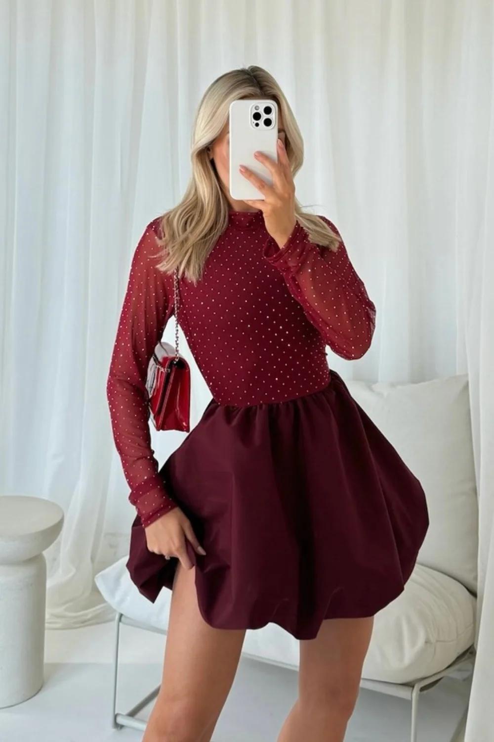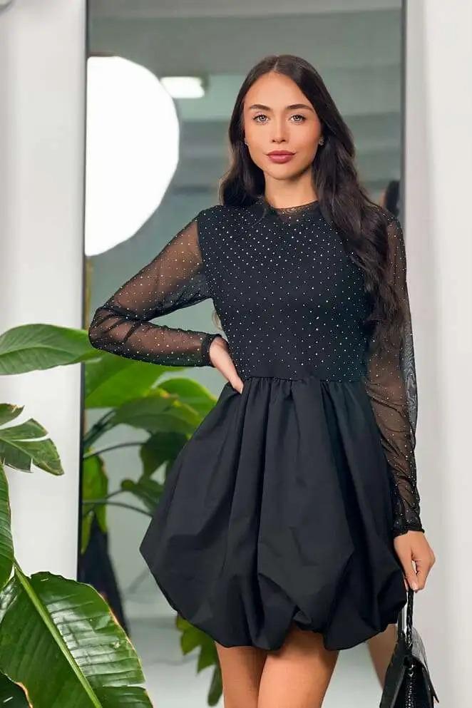 Vestido corto de una sola pieza que combina elegancia y un toque especial gracias a su diseño cuidado y femenino. La parte superior está confeccionada en tul semitransparente con pequeños puntos brillantes, aportando luz y sofisticación sin resultar excesivo. Incluye mangas largas de tul y cuello ligeramente subido, que equilibran el diseño y lo hacen ideal para eventos de otoño e invierno.