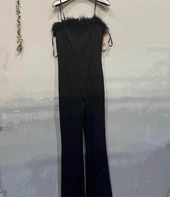 Mono negro palabra de honor con detalle de plumas en el escote. Elegante, favorecedor y perfecto para noches especiales.