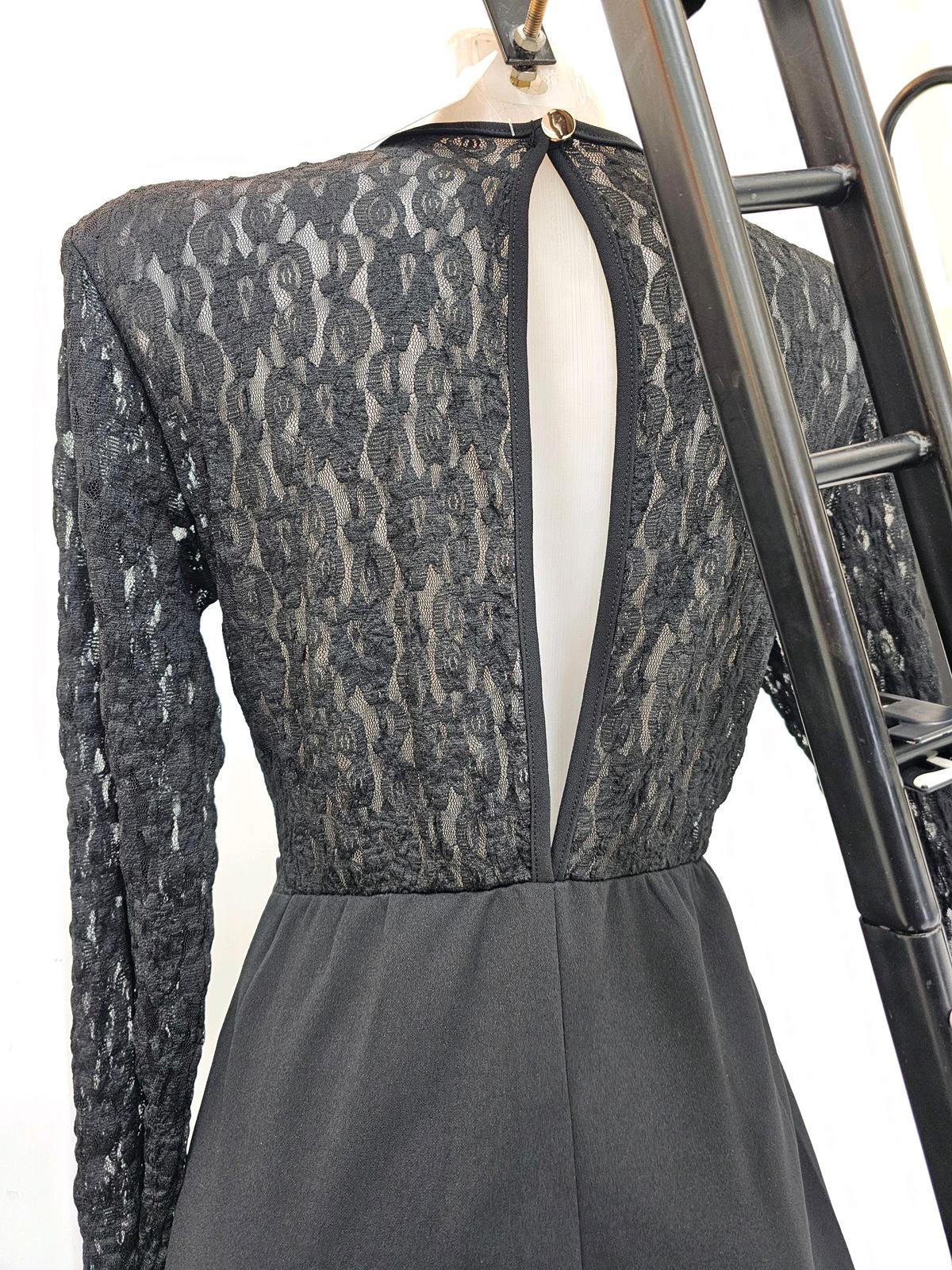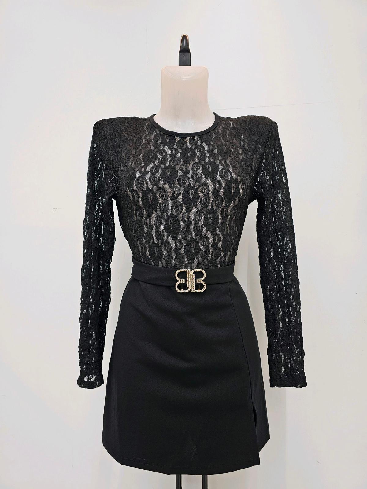 Mono corto negro de encaje con mangas largas y cinturón joya. Elegante, favorecedor y perfecto para eventos especiales.