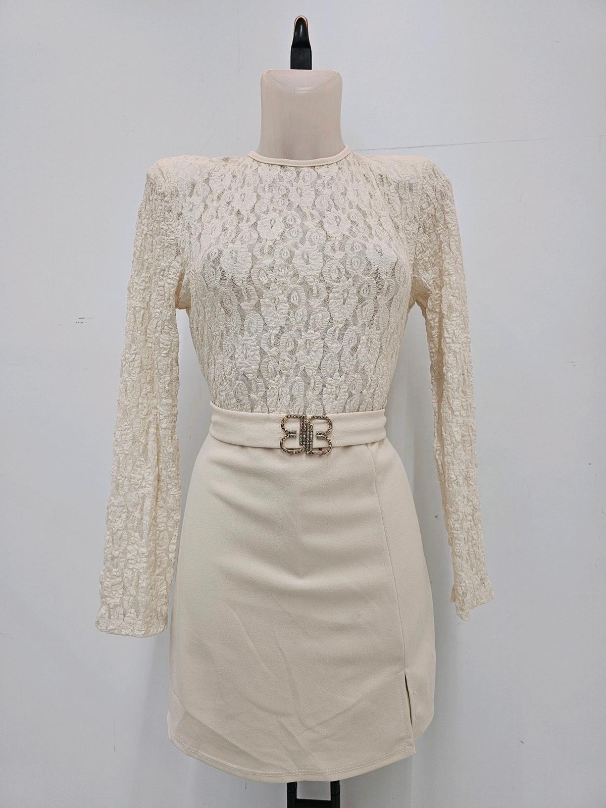 Las mangas largas de encaje y el cuello cerrado aportan sofisticación, mientras que el cinturón integrado con hebilla joya en dorado se convierte en el centro de todas las miradas. Es ese tipo de prenda que no necesita mucho más para destacar: te lo pones y el look está hecho.